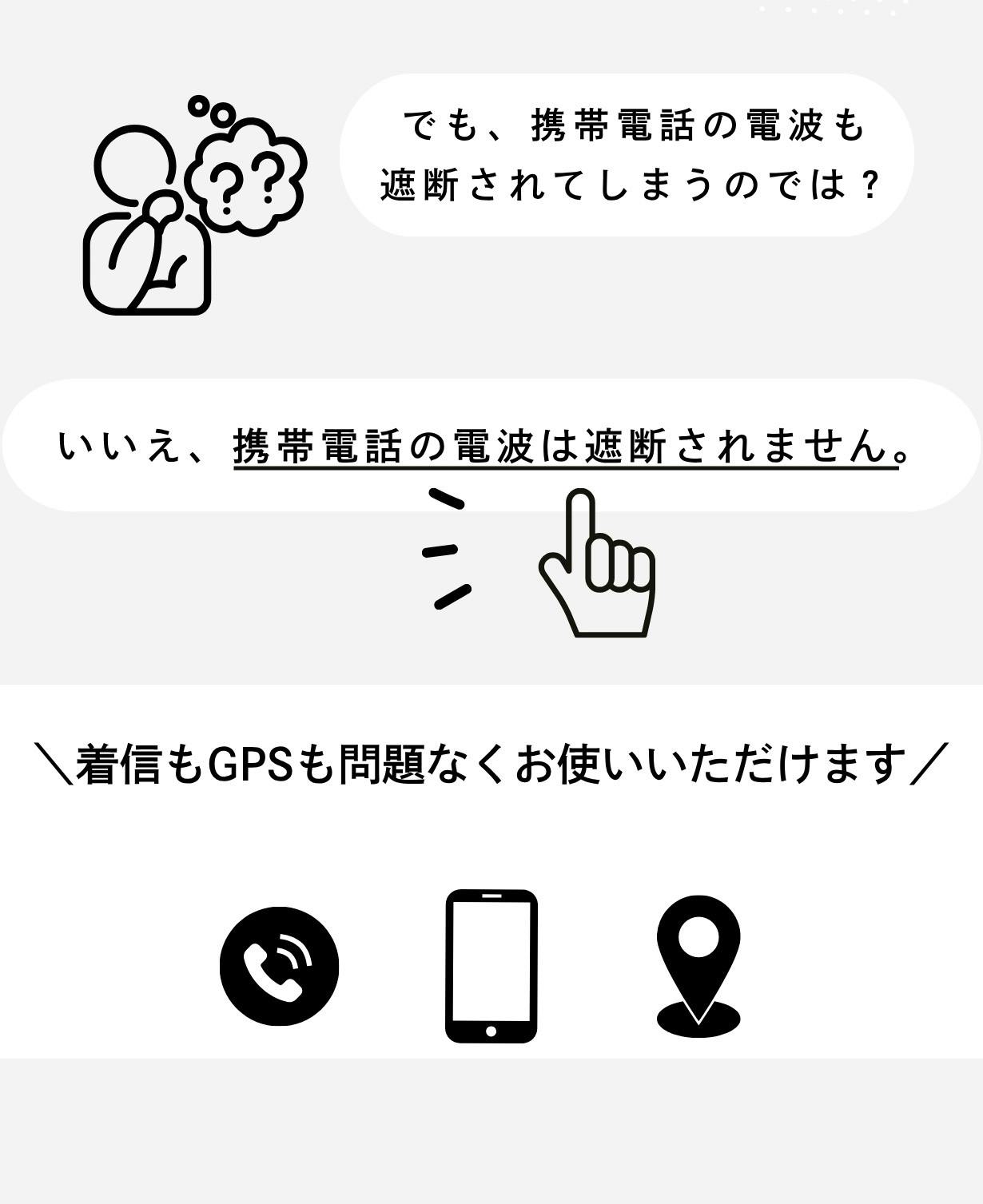 「RFIDブロック素材を使うと携帯が使えなくなるのでは?」というご質問をよくいただきますが、遮断されるのはクレジットカードやパスポートなどのICチップが使用する特定の周波数帯のみです。