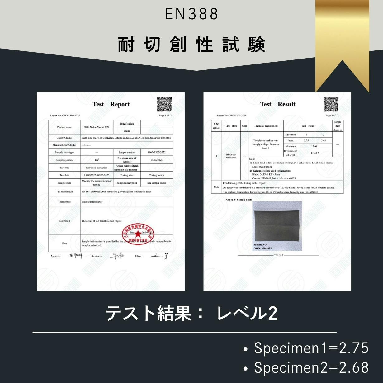 Morph C2Lの生地は、EN388規格における耐切創性レベル2をクリアしています。