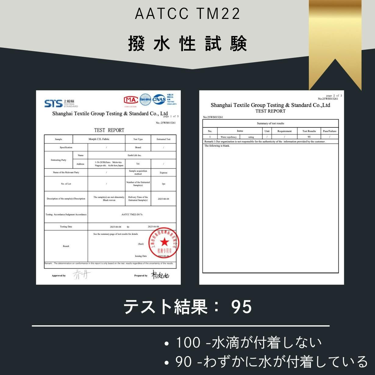 テスト結果は95。AATCC TM22は、ファブリックの撥水性を評価するための試験方法です。
