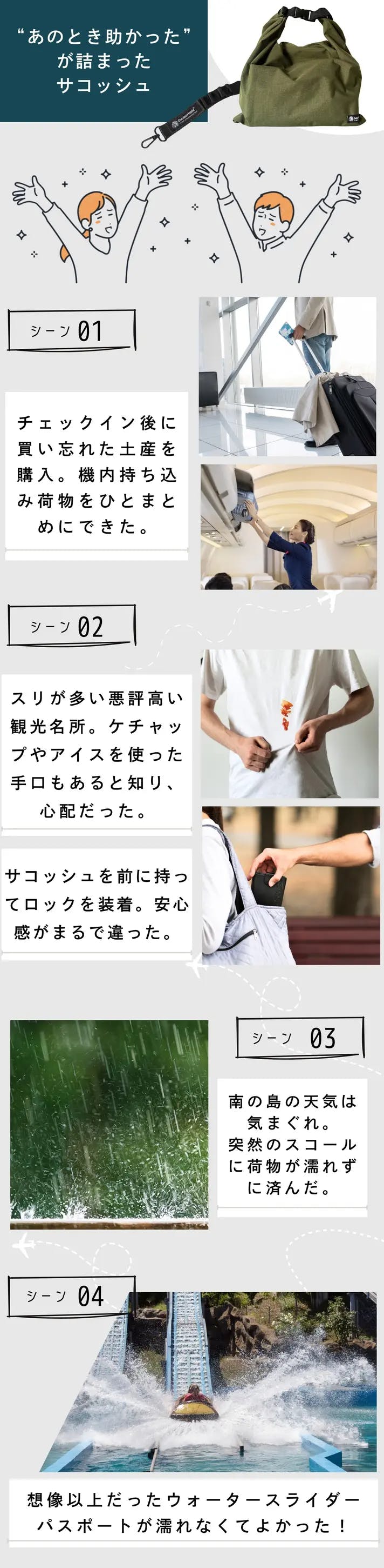 さらに、突然のスコールや汗で荷物が濡れたり、お土産を買いすぎて両手がふさがったり…。コントロールできない天候や不便さに不安もついてくる。