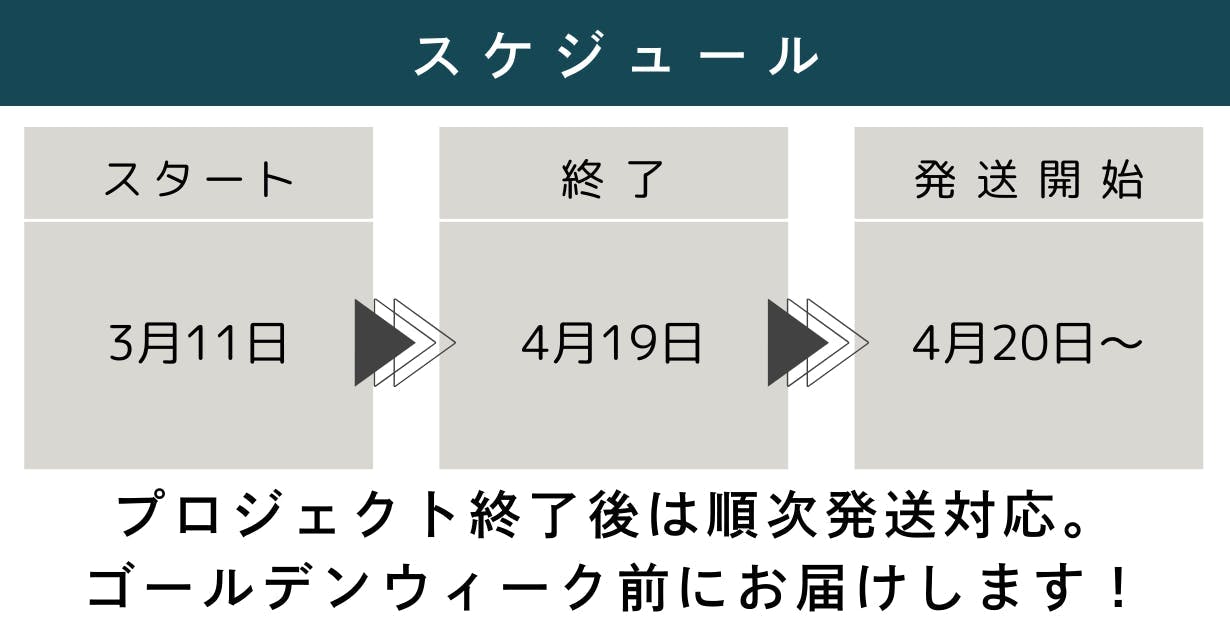 ・ご注文の状況や製造工程の都合で通関手続きや遅延、本プロジェクトで想定を上回るご支援をいただいた場合、出荷時期が遅れる場合があります。その場合はリターン発送遅延の旨をご連絡させていただきます。