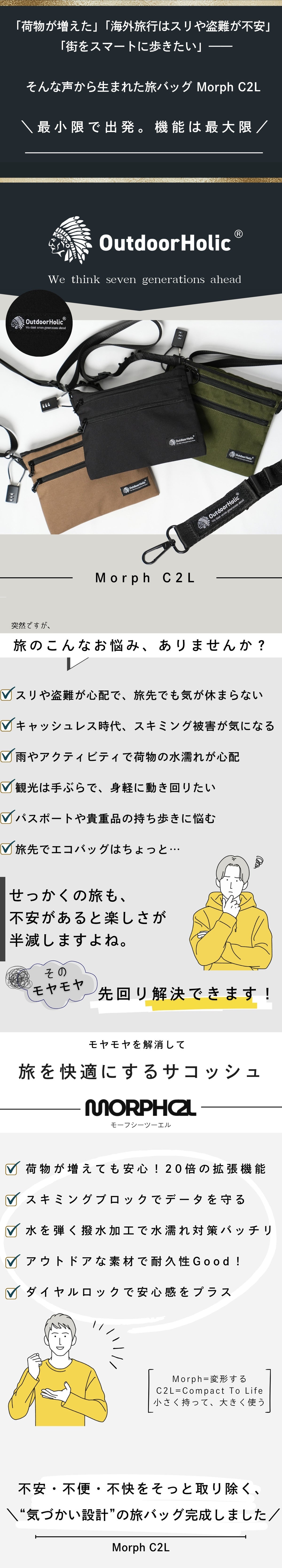 OutdoorHolicらしさを詰め込んだ旅アイテムMorph C2L(モーフシーツーエル)。国内はもちろん、海外旅行、近場のお出かけにも便利!今年のゴールデンウィークのお出かけのお供にいかがでしょうか?