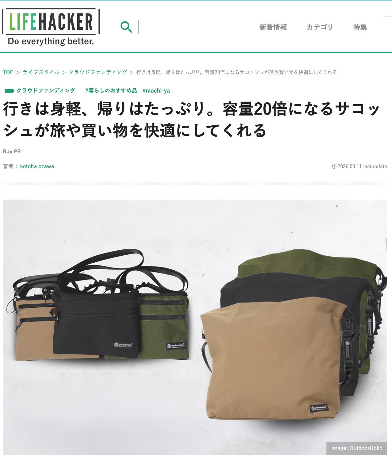 2026/03/12 09:06こんにちは!OutdoorHolicです。先日ローンチしたばかりの「Morph C2L」ですが、早くもWeb雑誌 Lifehacker にて紹介していただきました!▼掲載記事はこちらhttps://www.lifehacker.jp/article/machi-ya-morphc2l-start-928545/Lifehackerは、ガジェット・仕事術・ライフスタイルをテーマに世界中の最新プロダクトを紹介する人気メディアです。そんなLifehackerで今回注目していただいたのが、「小さく持って、大きく使う」変形サコッシュ Morph C2L。なぜMorph C2Lが紹介されたのか?記事では、次のポイントが評価されています。✔ 街ブラはサコッシュサイズでミニマルに✔ 荷物が増えたらトートバッグへ瞬時に拡張✔ RFIDスキミング防止+ダイヤルロックで旅の防犯対策✔ 撥水&耐久素材で旅先のトラブルにも安心旅行や街歩きで多くの人が感じる、「身軽に出かけたい。でも帰りは荷物が増える…」そんな悩みを解決するバッグとして紹介されています。お気に入り登録してくださっている皆さまへすでに多くの方にお気に入り登録をしていただいています。本当にありがとうございます!もし、・旅は身軽に動きたい・エコバッグを持ち歩くのが面倒・スキミングや防犯対策が気になるそんな方には、まさにこのバッグの出番です。Morph C2Lは「小さく持って、大きく使う」というコンセプトから生まれました。各リターンは数量限定です。すでに超早割のカラー:ブラックは完売しておりますが、現在公開中のリターンはmachi-ya限定の特別価格になっています。もし少しでも気になっている方は、ぜひこのタイミングでご検討ください。皆さまの応援がプロジェクトの力になります!引き続きどうぞよろしくお願いいたします。 もっと見る