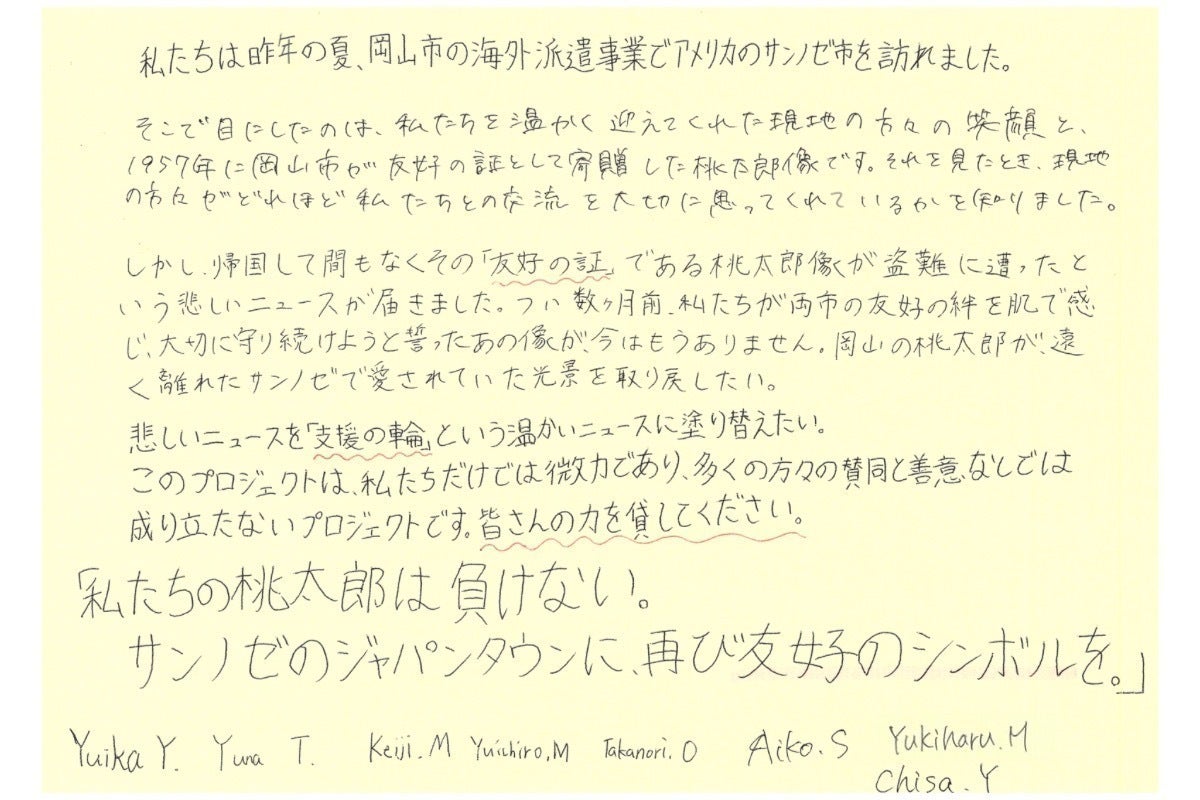 しかし、帰国して間もなくその「友好の証」である桃太郎像が盗難に遭ったという悲しいニュースが届きました。つい数ヶ月前、たちが両市の友好の絆を肌で感じ、大切に守り続けようと誓ったあの像が、今はもうありません。岡山の桃太郎が、遠く離れたサンノゼで愛されていた光景を取り戻したい。悲しいニュースを「支援の輪」という温かいニュースに塗り替えたい。