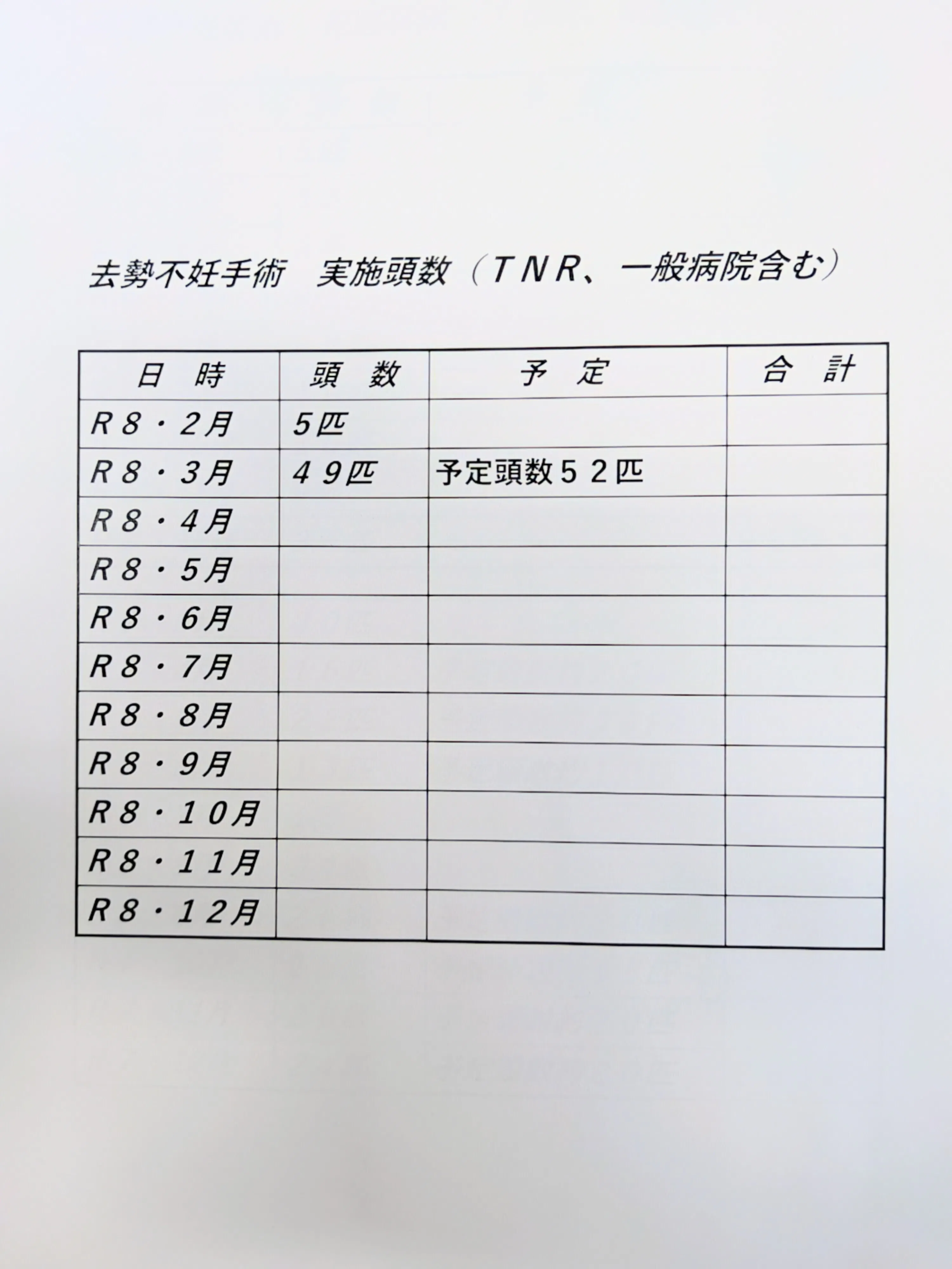2月の去勢不妊手術は5頭、3月の去勢不妊手術は52頭の予定です。