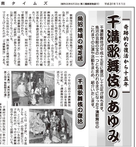 しかしその後新型コロナの影響等で活動を縮小していましたが、令和6年、7年に干溝町内からお二人の百歳の方を輩出いたしました。また昨年魚沼市が市制施行二十周年を迎え、地域の名称やブランドが改めて注目される節目の年となりました。この機会に干溝歌舞伎も「魚沼市の干溝歌舞伎」として再び歩み出し、地域文化を未来へ継承していくよう今回の公演を企画し、魚沼市をはじめ魚沼市教育委員会、魚沼市響の森文化会館から共催をいただき、市文化協会、市観光協会などのご協力のもと、「干溝歌舞伎公演実行委員会」を立ち上げ準備を進めています。