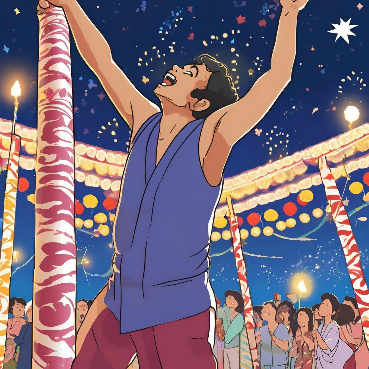 名曲「世界でいちばん熱い夏」を盆踊りアレンジ。作詞者の富田京子が自ら櫓の上で太鼓を叩きます。