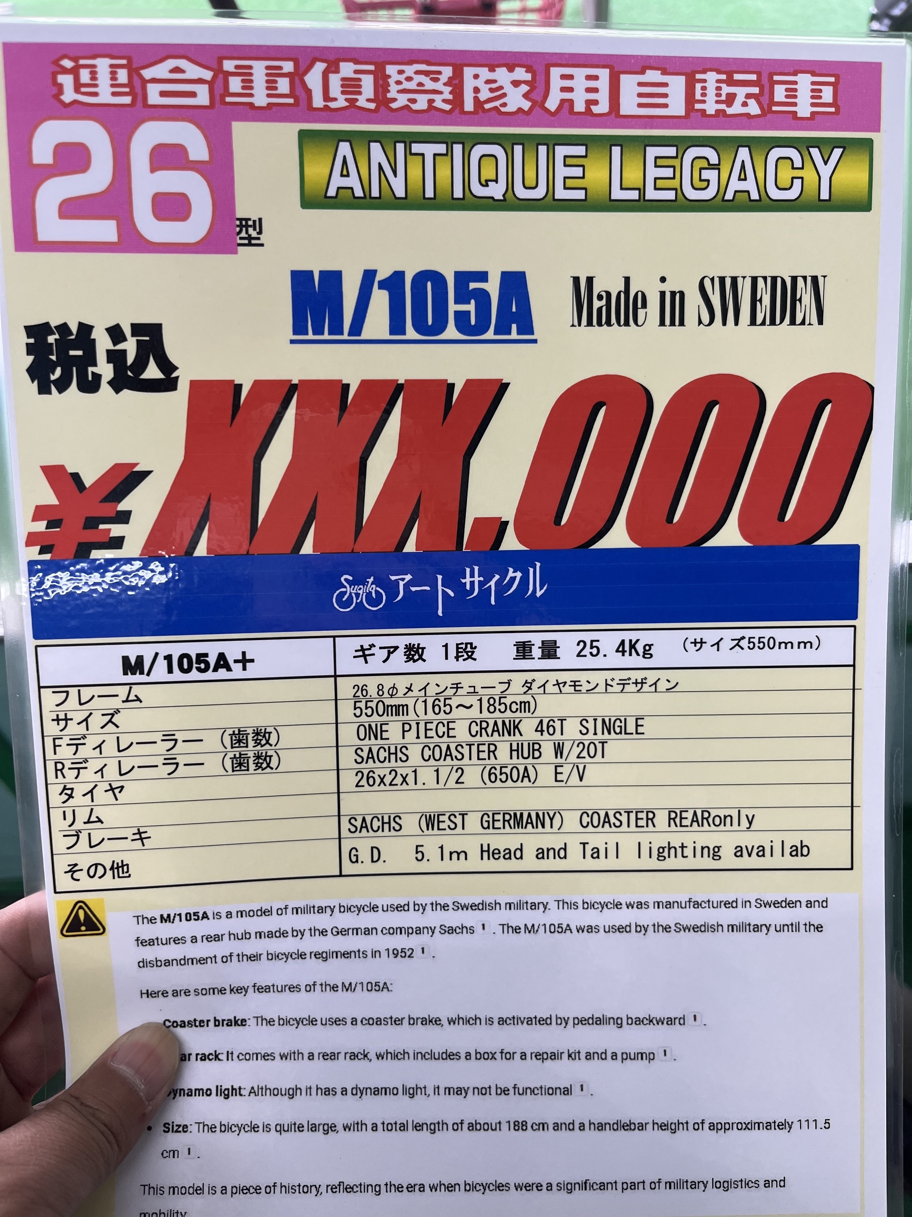 『連合軍偵察隊用自転車』というネーミング(おそらく店主が命名)でSweden製です。