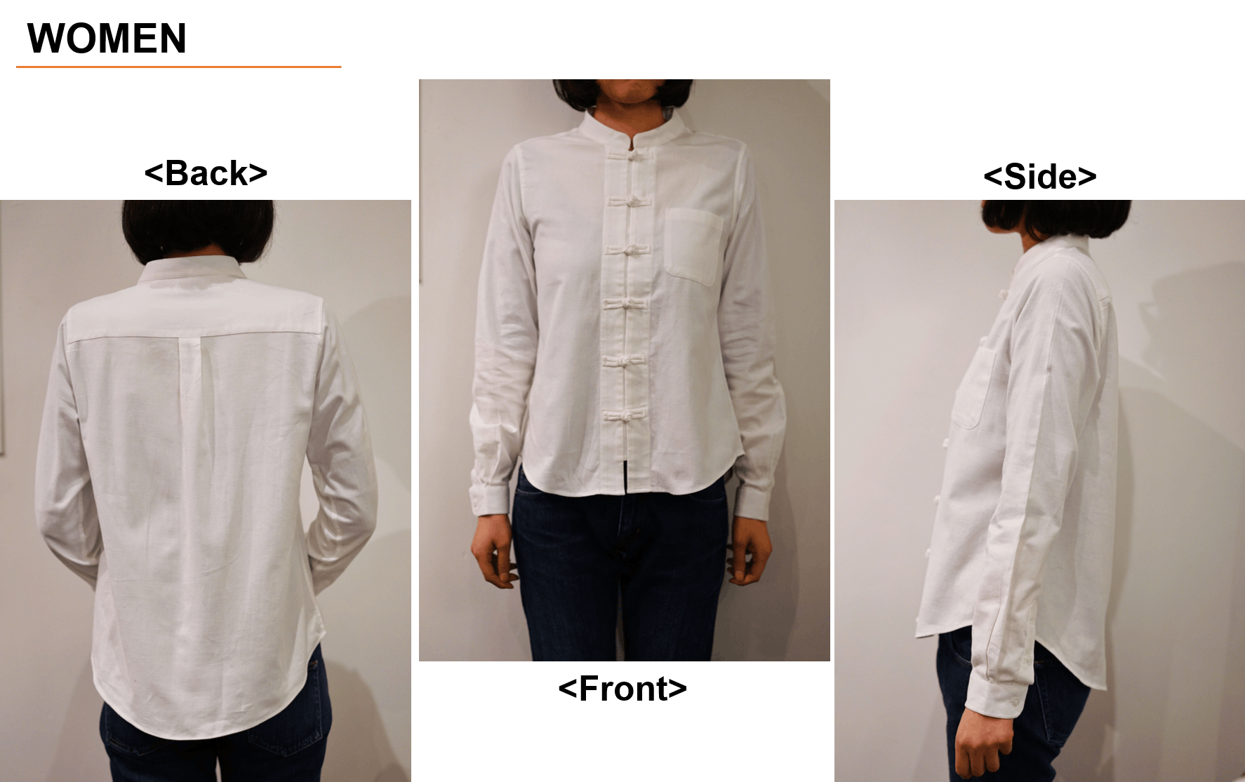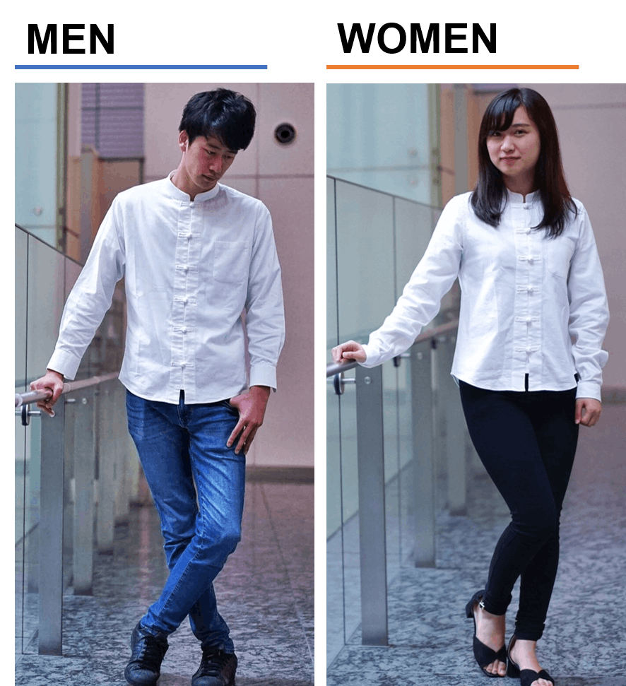 今回のプロジェクトでご用意しました世界一普通なチャイナシャツは、メンズ・レディースそれぞれ普段着として最も定番のカラーである白のシャツに仕上げています。