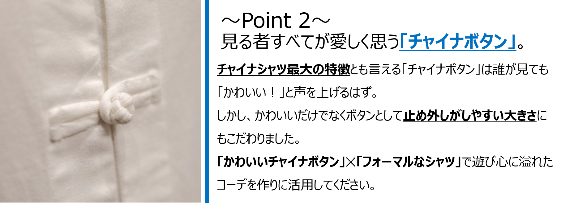 今回のチャイナシャツは今までのチャイナシャツの個性を残しつつも、