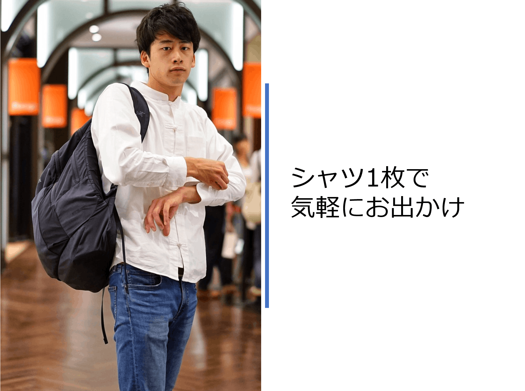 オフィスでの作業にも支障はきたさないため、着る場所を選びません。