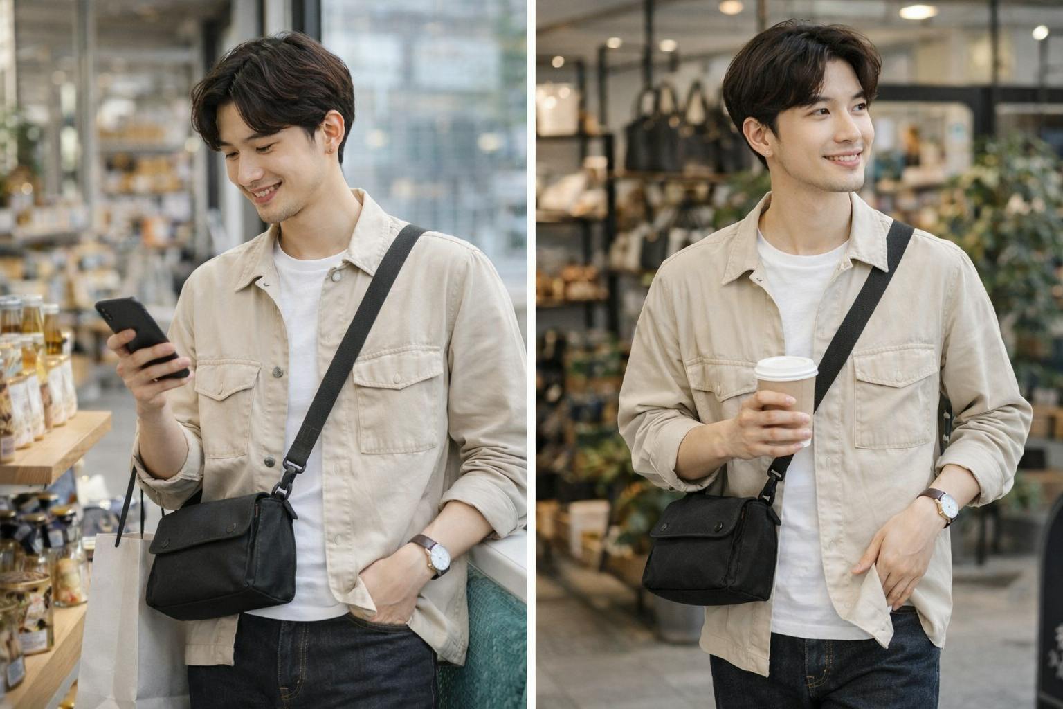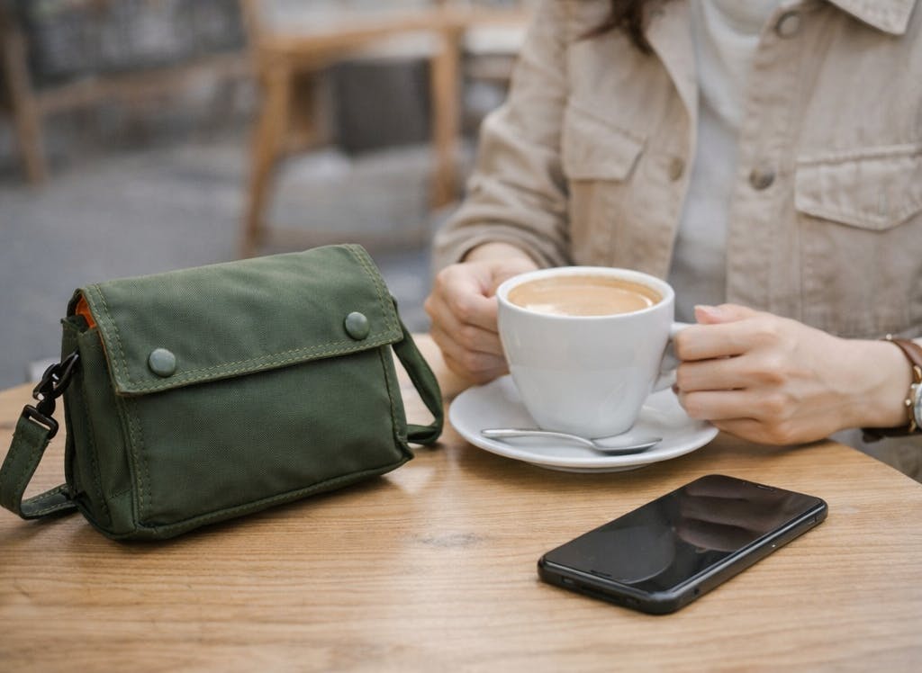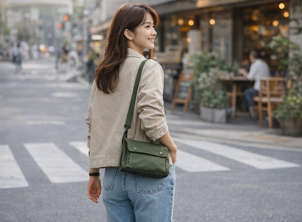 スマートフォンや財布、小物を整理して収納できるサイズ感で、歩き回る日でも負担になりにくい軽さです。