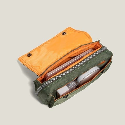 スマートフォン、財布、イヤホン、モバイルバッテリーなど、必要なものを整理して収納できる構造。