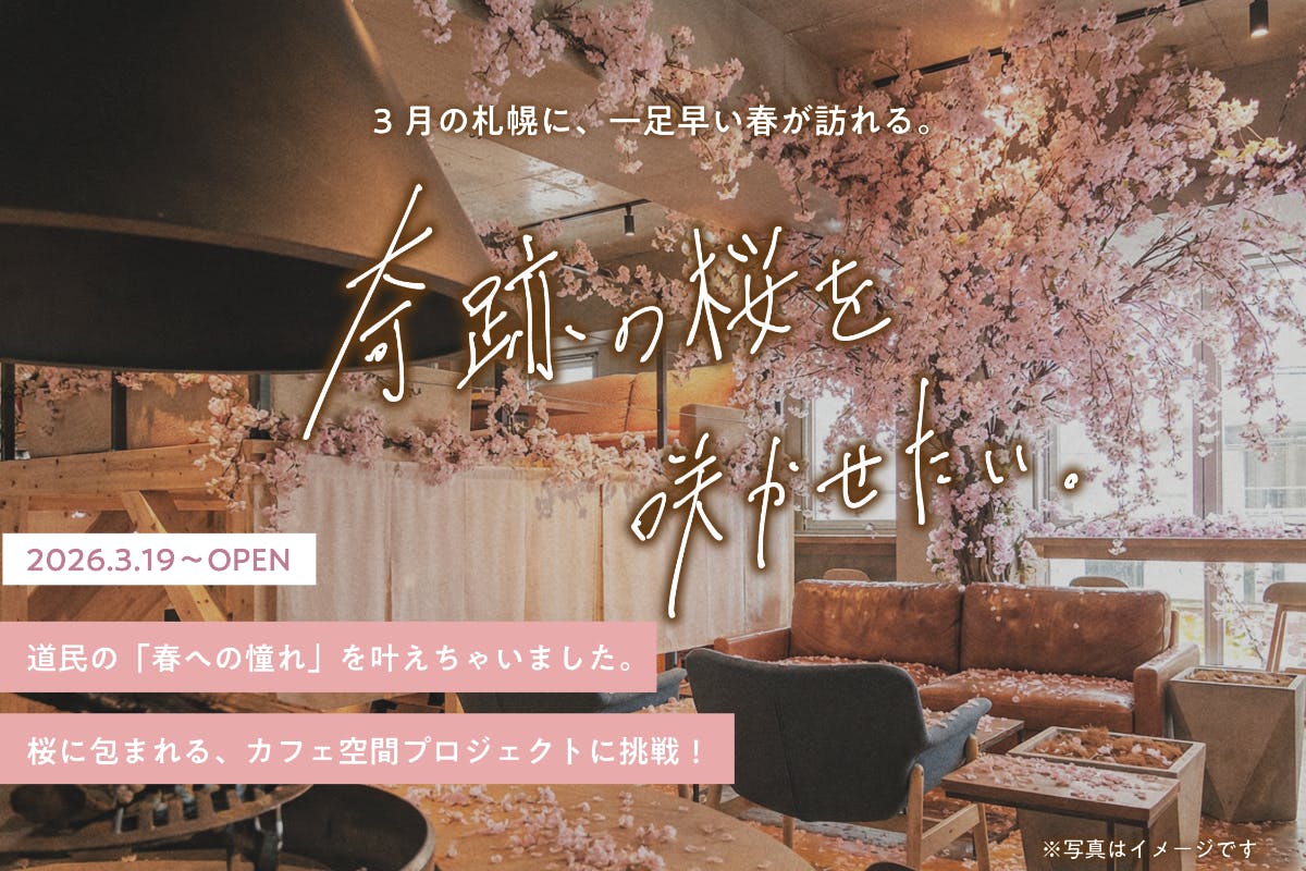 舞台は、札幌市北区にあるカフェ「サクラビレッジカフェ」。店内を、生花と見紛うほど高品質な「アーティフィシャルフラワー(造花)」の桜で埋め尽くし、360度桜に包まれる圧倒的なスケール感の空間を出現させます。