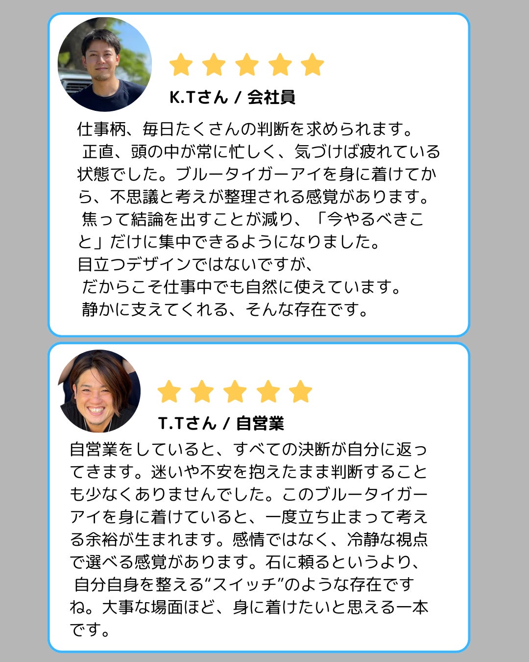 ブルータイガーアイに惹かれた理由は、強さを誇示しないのに、芯のある存在感。派手さではなく、整った印象を残す“青の深さ”にありました。アクセサリーは身に着けることで何かを誓ったり、気持ちを切り替えたりする「スイッチ」になるもの。だからこそ私たちは、毎日使えて、生活の邪魔をしない形にこだわっています。Makuakeでは、「買って終わり」ではなく、使うほどに自分に馴染んでいく体験を届けたい。ブルータイガーアイが、あなたの大切な一日や、勝負の日のそばにある存在になれば嬉しいです。