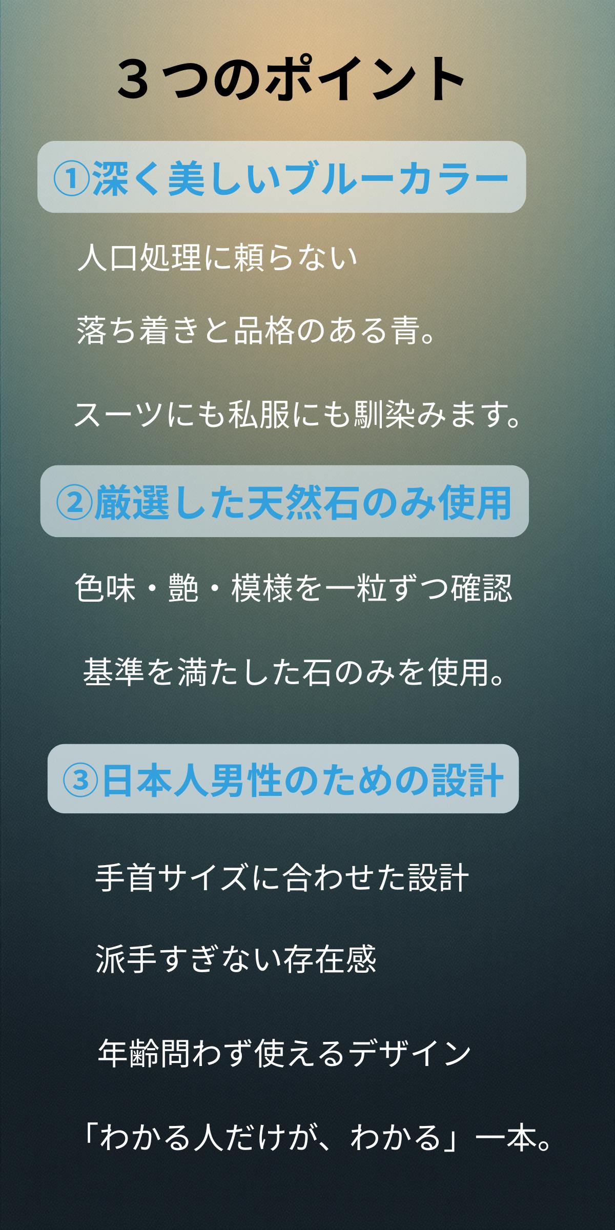 ブルータイガーアイに惹かれた理由は、強さを誇示しないのに、芯のある存在感。派手さではなく、整った印象を残す“青の深さ”にありました。アクセサリーは身に着けることで何かを誓ったり、気持ちを切り替えたりする「スイッチ」になるもの。だからこそ私たちは、毎日使えて、生活の邪魔をしない形にこだわっています。Makuakeでは、「買って終わり」ではなく、使うほどに自分に馴染んでいく体験を届けたい。ブルータイガーアイが、あなたの大切な一日や、勝負の日のそばにある存在になれば嬉しいです。