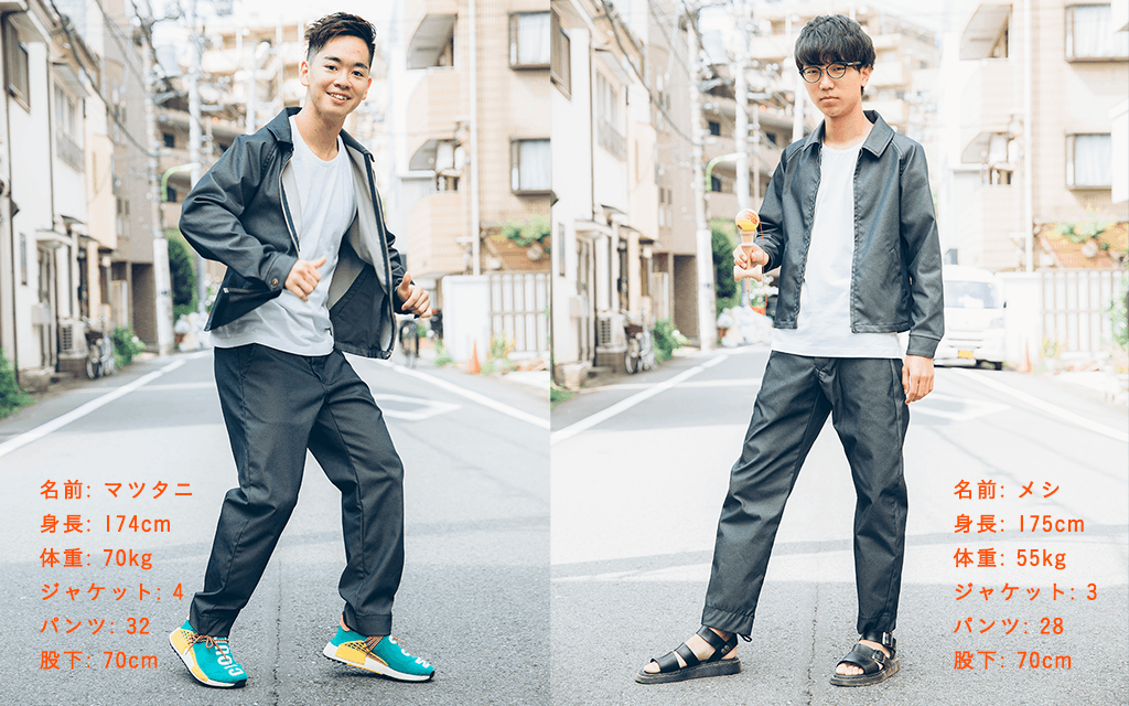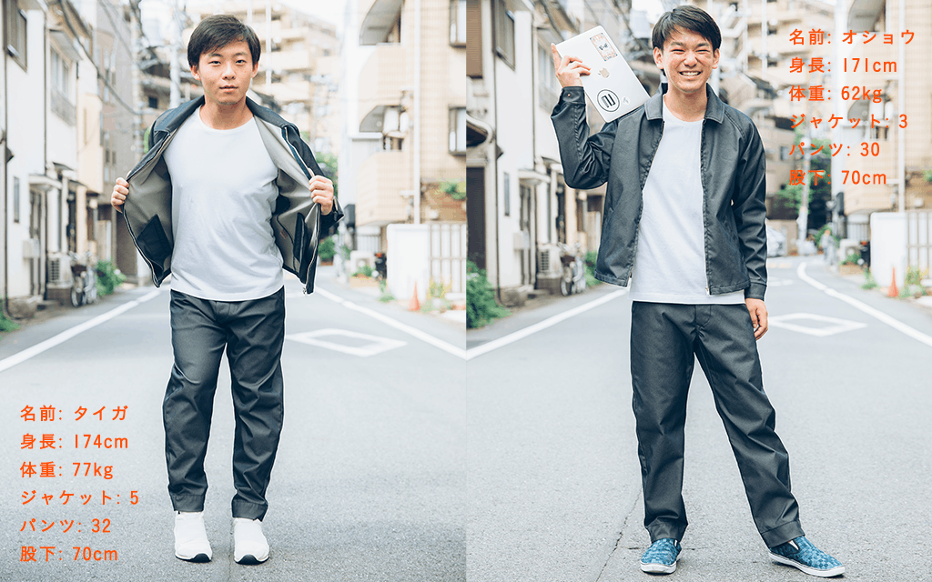 このプロジェクトの公開に先立って、大試着大会をしました。サイズ感や股下の長さの参考にしてください!パンツはすべて股下70㎝で仕上がったものを穿いています。