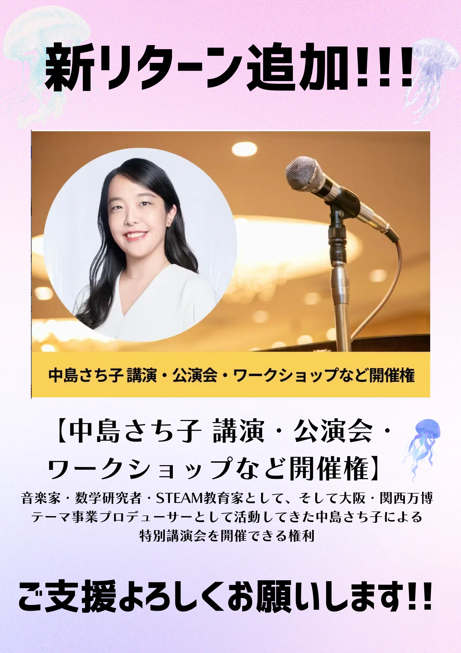 追加リターンのお知らせ 中島さち子 講演・公演会・ワークショップ開催権