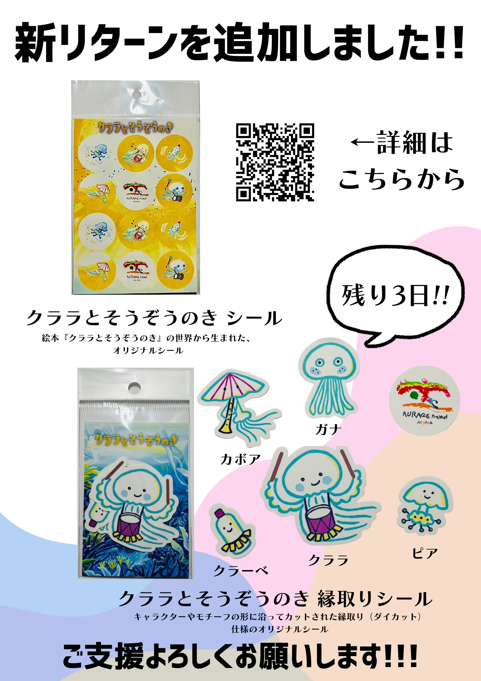 2026/03/28 18:42クラゲ館クラウドファンディングに、新しいリターンが加わりました!絵本『クララとそうぞうのき』(作:中島さち子、絵:くすはら順子、出版:ひかりのくに株式会社)の世界から生まれた、オリジナルシールです。クララが旅の中で出会ってきた仲間たち、クラーベ、ガナ、ピア、カボアらが集まった、やさしく楽しいデザインとなっています。ノートやパソコン、スマートフォン、ボトルなど、日常のさまざまな場所に貼ることで、物語の世界や「そうぞうする楽しさ」を、身近に感じていただけたら嬉しいです。★追加リターン【クララとそうぞうのき シール】物語に登場するキャラクターたちが一枚に集まった、可愛らしいオリジナルシールです。日常の持ち物に貼ることで、いつでも物語の世界とつながることができます。★追加リターン【クララとそうぞうのき 縁取り(ダイカット)シール】キャラクターやモチーフの形に沿ってカットされた、縁取り仕様(ダイカット)のシールです。 一つ一つのキャラクターがより立体的に感じられ、物語の世界をより楽しく味わっていただけます。クラゲ館プロジェクトでは、「多様な個性が出会い、共に創造すること」を大切にしています。本リターンを通して、絵本の世界観やメッセージを、日常の中でも感じていただけたら幸いです。クラウドファンディング終了まで 残り3日 となりました。ここまで応援してくださっている皆さま、本当にありがとうございます。最後まで、どうぞよろしくお願いいたします。 もっと見る