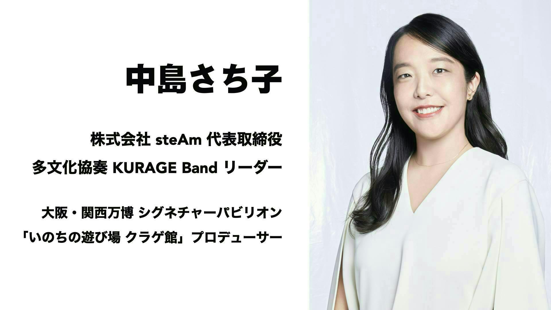 みなさん、こんにちは。2025年に開催された、大阪・関西万博シグネチャーパビリオン「いのちの遊び場 クラゲ館」プロデューサーの中島さち子です。音楽家・数学研究者・STEAM 教育者*でもあり、創造性の民主化を通じて Playful な共創社会を目指す株式会社 steAm 代表取締役も務めています。」
