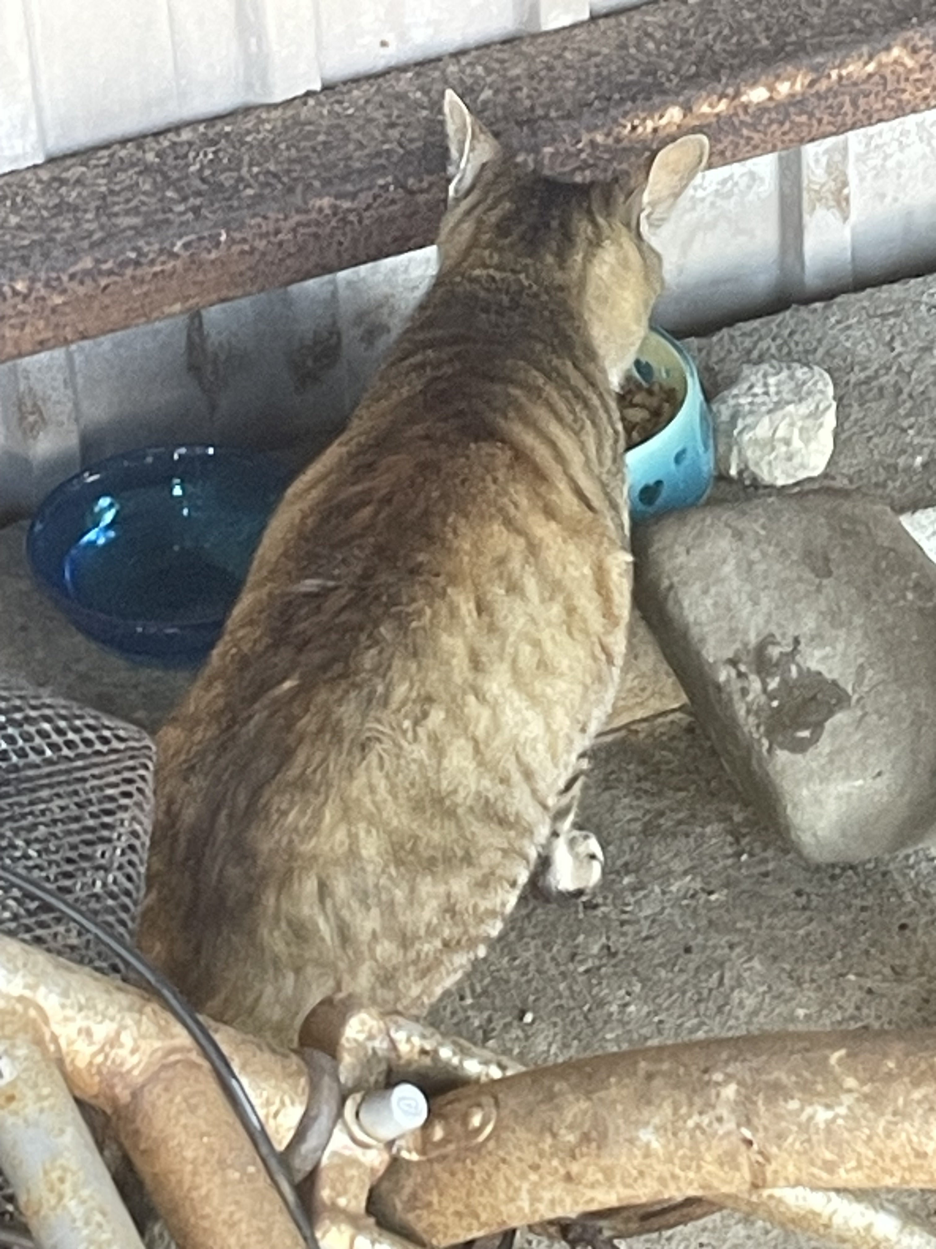 毎日バスに乗って電車に乗って仕事に行きます。バス停まで約1kmです。自宅からバス停まで行く途中2ヶ所餌やりして行きます。バス停近くの駐輪場にも猫が来るのであげるようになりました。数匹来ているようですが見かけても逃げます。1匹だけ威嚇はしますが餌のところまで顔を出します。このキジトラです。メスでお腹大きい⁈っぽいので家近くの茶トラとどっちを狙うか迷っています…