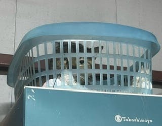 ガレージの棚の上のカゴにも寝てる子がいます。使い捨てカイロ必需品です。