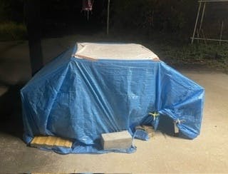 庭のカーポート内には折り畳みテーブルにブルーシートを覆いテントのようにして、中に2つ箱の寝床を入れています。そこにも1匹入っています。