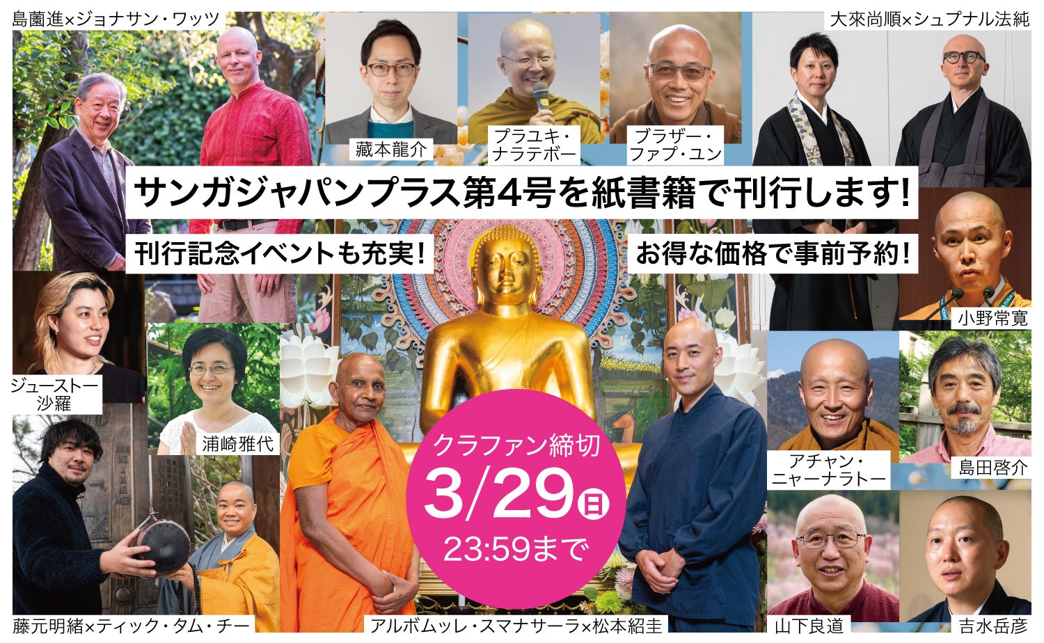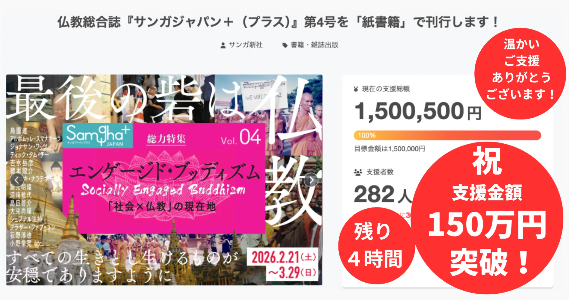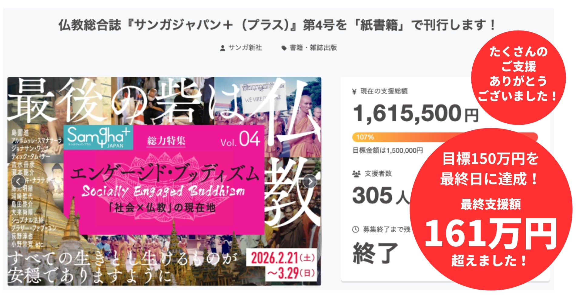 2026/03/30 13:00「161万5500円」&「305名」のご支援、ありがとうございました!2026年2月21日に募集を開始したクラウドファンディング「仏教総合誌『サンガジャパン+(プラス)』第4号を紙書籍で刊行します!」は、2026年3月29日(日)23:59をもって、無事に終了いたしました。昨夜、締切の瞬間を迎えたときの高揚と感謝の気持ちが、いまもまだ胸に残っています。期間中、本当にたくさんの方に応援していただき、ご支援くださった皆さん、情報を広めてくださった皆さん、気にかけてくださった皆さんに、心より深く御礼申し上げます。目標金額150万円を掲げてスタートした本プロジェクトは、最終的に「支援総額161万5500円」「支援者数305名」というかたちで締めくくることができました。目標を上回るご支援をお寄せいただきましたこと、心より深く感謝申し上げます!最後の最後まで押し上げてくださった皆さんのお力によって、『サンガジャパン+』第4号刊行への道を、確かなものにしていただきました。今回のクラウドファンディングは、仏教総合誌『サンガジャパン+』第4号を、紙の本として刊行するためのプロジェクトでした。特集テーマは「エンゲージド・ブッディズム」です。混迷を深める時代のなかで、仏教は社会にどう関わり、苦しみの現場にどう応答するのか。その問いに向き合う一冊を皆さんとともに送り出せることを、本当にありがたく思っています。クラウドファンディングを通して受け取った想いこのクラウドファンディングでは、ご支援とともに、たくさんの応援の言葉も寄せていただきました。最終日の締切間際にも多くのメッセージをいただきましたので、その一部を以下にご紹介いたします。◆平和は一人一人の平和から。わたしが平和であること、そこから始まることを伝えてくださる繋がりに感謝し、ささやかながら応援しております!◆多彩な方々の投稿を拝読できますこと、楽しみにしております。生きとし生けるものが幸せであります様に。◆応援しています!頑張ってください!良い企画を有難うございます。シスターチャイの対談、楽しみです。◆長老、サンガに感謝しかないです。三宝のご加護がありますように。◆スマナサーラ長老のお言葉は何度で心に染渡ります。この度の書籍感謝!M.Y◆出版不況の中、貴重な雑誌を維持してくださる皆さまに感謝◆応援しています!頑張ってください!楽しみにしています。◆仏教の智慧がより多くの方のもとに届くよう、微力ながら支援させていただきます。◆『サンガジャパン+』第4号の刊行を祈念いたします。◆本が届くのを楽しみにしています。ご苦労もあるかと思いますが頑張ってください!◆仏教を応援させていただける機会をありがとうございます。◆やはり紙書籍が良いですね・・・楽しみにしています♪◆いつも仏教の本を出版してくださってありがとうございます。サンガさんのお陰で仏教の勉強ができます。今後もよろしくお願いします。◆いつも、ありがとうございますサンガ新社発行の本が心の支えになってます◆生まれてきた全てのものが幸せな一生を送れるように一緒にできることを行います。◆本が届くのを楽しみにしています。頑張って下さい。◆貴重な法施の機会をありがとうございます。◆本の発刊、楽しみにしています。◆生きとし生けるものが幸せでありますように◆いつもインスピレーションをいただいております!◆遅くの応援でごめんなさい・・それでも、達成しましたね、おめでとうございます(^o^)◆御本を拝読するのを楽しみにしています。◆もう少し!少しでも多くの方のご支援を!◆もうちょっとですね、頑張ってください!◆サンガジャパンさんには求道の過程でたくさんお世話になりました。これからも応援しております。 合掌◆あとちょっとですね。達成できると良いですね!◆お釈迦様の教えに出会えた事を心より感謝しております。生きとし生けるものが幸せでありますように。◆紙での発刊をありがとうございます。◆サンガ新社の皆様、素晴らしい企画をありがとうございます(^^)楽しみにしています!◆プロジェクトに間に合ってよかったです!楽しみにじっくり拝読させて頂きます◆書店でスマナサーラ長老の本を見かけることが少なくなりました。これからの人たちが苦に気づいた時いろんな選択肢を持てるよう新サンガ応援しています!◆良いご縁に恵まれますように◆皆様のご活動で、1人でも多くの方の、悩み苦しみが無くなりますように。◆陰ながら応援しています!頑張ってください!◆やはり紙書籍で読みたいです!頑張ってください!◆誰からも検証可能でアクセス可能な状況、その一歩になりますように!◆いつも貴重な智慧を分けていただく機会をありがとうございます!◆サンガジャパンが今後も私達の元にそしてより多くの方に届けられますように。◆ギリギリですみません。今回も1冊お願いします。◆世の中に安穏なれ!2026年5月末に『サンガジャパン+』第4号をお届けしますこれ