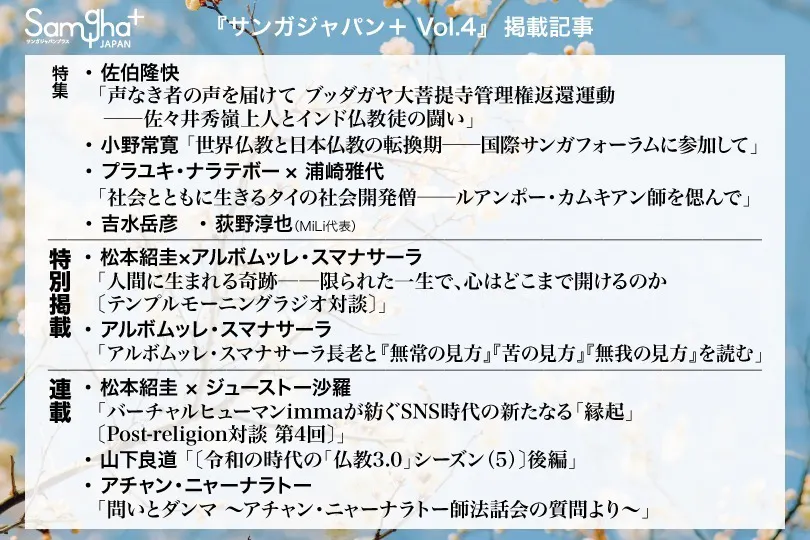 『サンガジャパン+(プラス)』は2022年の創刊号からクラウドファンディングで事前予約をいただきながら刊行してきました。創刊号から第3号まで毎号、仏教の普遍的価値と現在的意味を特集してきましたが、第4号では社会と仏教のかかわりを特集します。「エンゲージド・ブッディズム」(Socially Engaged Buddhism)、日本語では「社会参加仏教」や「社会参画仏教」などと呼ばれる、仏教の社会的実践の現在に注目します。