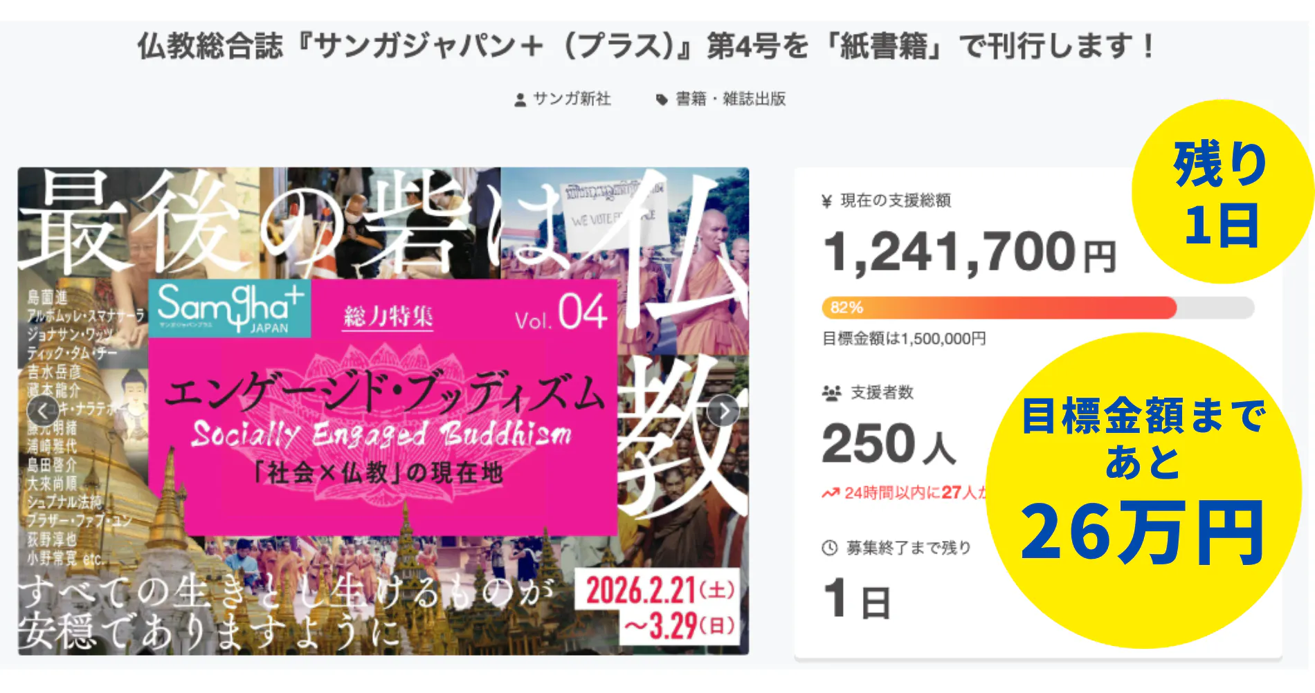 「161万5500円」&「305名」のご支援、ありがとうございました!2026年2月21日に募集を開始したクラウドファンディング「仏教総合誌『サンガジャパン+(プラス)』第4号を紙書籍で刊行します!」は、2026年3月29日(日)23:59をもって、無事に終了いたしました。昨夜、締切の瞬間を迎えたときの高揚と感謝の気持ちが、いまもまだ胸に残っています。期間中、本当にたくさんの方に応援していただき、ご支援くださった皆さん、情報を広めてくださった皆さん、気にかけてくださった皆さんに、心より深く御礼申し上げます。目標金額150万円を掲げてスタートした本プロジェクトは、最終的に「支援総額161万5500円」「支援者数305名」というかたちで締めくくることができました。目標を上回るご支援をお寄せいただきましたこと、心より深く感謝申し上げます!最後の最後まで押し上げてくださった皆さんのお力によって、『サンガジャパン+』第4号刊行への道を、確かなものにしていただきました。今回のクラウドファンディングは、仏教総合誌『サンガジャパン+』第4号を、紙の本として刊行するためのプロジェクトでした。特集テーマは「エンゲージド・ブッディズム」です。混迷を深める時代のなかで、仏教は社会にどう関わり、苦しみの現場にどう応答するのか。その問いに向き合う一冊を皆さんとともに送り出せることを、本当にありがたく思っています。クラウドファンディングを通して受け取った想いこのクラウドファンディングでは、ご支援とともに、たくさんの応援の言葉も寄せていただきました。最終日の締切間際にも多くのメッセージをいただきましたので、その一部を以下にご紹介いたします。◆平和は一人一人の平和から。わたしが平和であること、そこから始まることを伝えてくださる繋がりに感謝し、ささやかながら応援しております!◆多彩な方々の投稿を拝読できますこと、楽しみにしております。生きとし生けるものが幸せであります様に。◆応援しています!頑張ってください!良い企画を有難うございます。シスターチャイの対談、楽しみです。◆長老、サンガに感謝しかないです。三宝のご加護がありますように。◆スマナサーラ長老のお言葉は何度で心に染渡ります。この度の書籍感謝!M.Y◆出版不況の中、貴重な雑誌を維持してくださる皆さまに感謝◆応援しています!頑張ってください!楽しみにしています。◆仏教の智慧がより多くの方のもとに届くよう、微力ながら支援させていただきます。◆『サンガジャパン+』第4号の刊行を祈念いたします。◆本が届くのを楽しみにしています。ご苦労もあるかと思いますが頑張ってください!◆仏教を応援させていただける機会をありがとうございます。◆やはり紙書籍が良いですね・・・楽しみにしています♪◆いつも仏教の本を出版してくださってありがとうございます。サンガさんのお陰で仏教の勉強ができます。今後もよろしくお願いします。◆いつも、ありがとうございますサンガ新社発行の本が心の支えになってます◆生まれてきた全てのものが幸せな一生を送れるように一緒にできることを行います。◆本が届くのを楽しみにしています。頑張って下さい。◆貴重な法施の機会をありがとうございます。◆本の発刊、楽しみにしています。◆生きとし生けるものが幸せでありますように◆いつもインスピレーションをいただいております!◆遅くの応援でごめんなさい・・それでも、達成しましたね、おめでとうございます(^o^)◆御本を拝読するのを楽しみにしています。◆もう少し!少しでも多くの方のご支援を!◆もうちょっとですね、頑張ってください!◆サンガジャパンさんには求道の過程でたくさんお世話になりました。これからも応援しております。 合掌◆あとちょっとですね。達成できると良いですね!◆お釈迦様の教えに出会えた事を心より感謝しております。生きとし生けるものが幸せでありますように。◆紙での発刊をありがとうございます。◆サンガ新社の皆様、素晴らしい企画をありがとうございます(^^)楽しみにしています!◆プロジェクトに間に合ってよかったです!楽しみにじっくり拝読させて頂きます◆書店でスマナサーラ長老の本を見かけることが少なくなりました。これからの人たちが苦に気づいた時いろんな選択肢を持てるよう新サンガ応援しています!◆良いご縁に恵まれますように◆皆様のご活動で、1人でも多くの方の、悩み苦しみが無くなりますように。◆陰ながら応援しています!頑張ってください!◆やはり紙書籍で読みたいです!頑張ってください!◆誰からも検証可能でアクセス可能な状況、その一歩になりますように!◆いつも貴重な智慧を分けていただく機会をありがとうございます!◆サンガジャパンが今後も私達の元にそしてより多くの方に届けられますように。◆ギリギリですみません。今回も1冊お願いします。◆世の中に安穏なれ!2026年5月末に『サンガジャパン+』第4号をお届けしますこれから、『サン