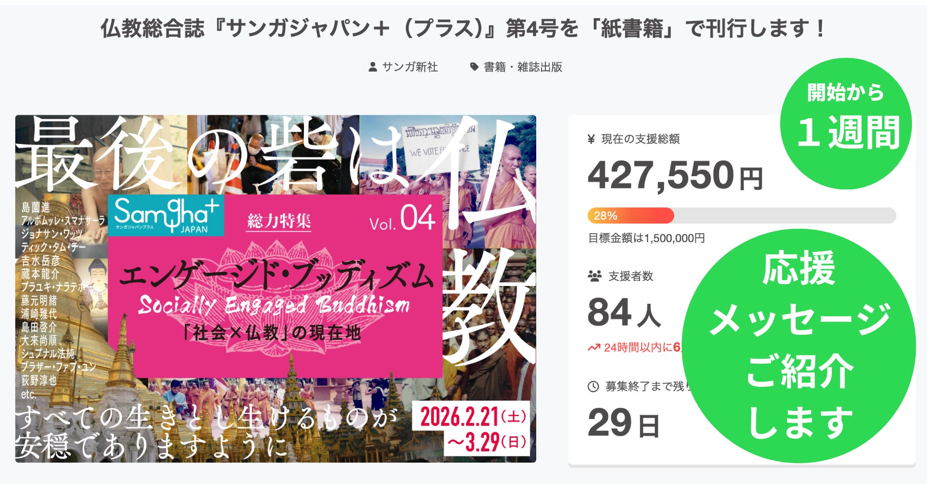 「仏教総合誌『サンガジャパン+(プラス)』第4号を「紙書籍」で刊行します!」クラウドファンディングは、