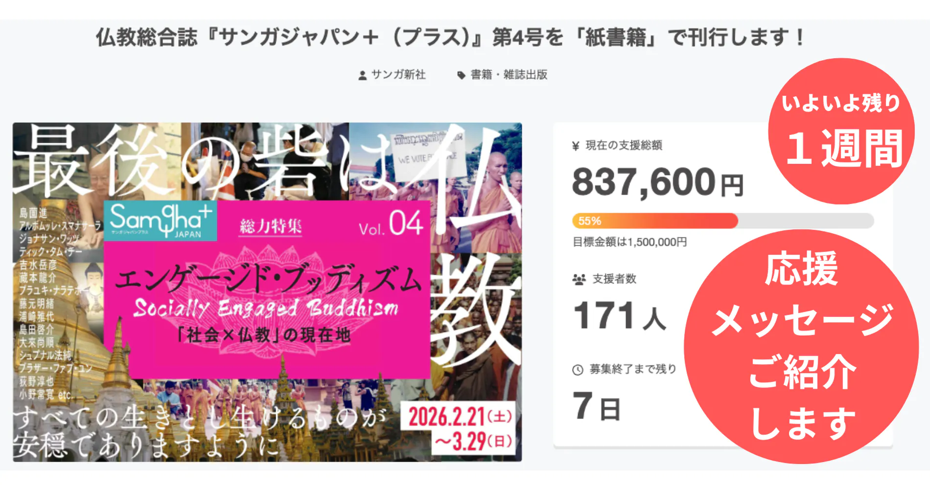 「仏教総合誌『サンガジャパン+(プラス)』第4号を紙書籍で刊行します!」クラウドファンディングは、募集終了までいよいよ残り1週間となりました。
