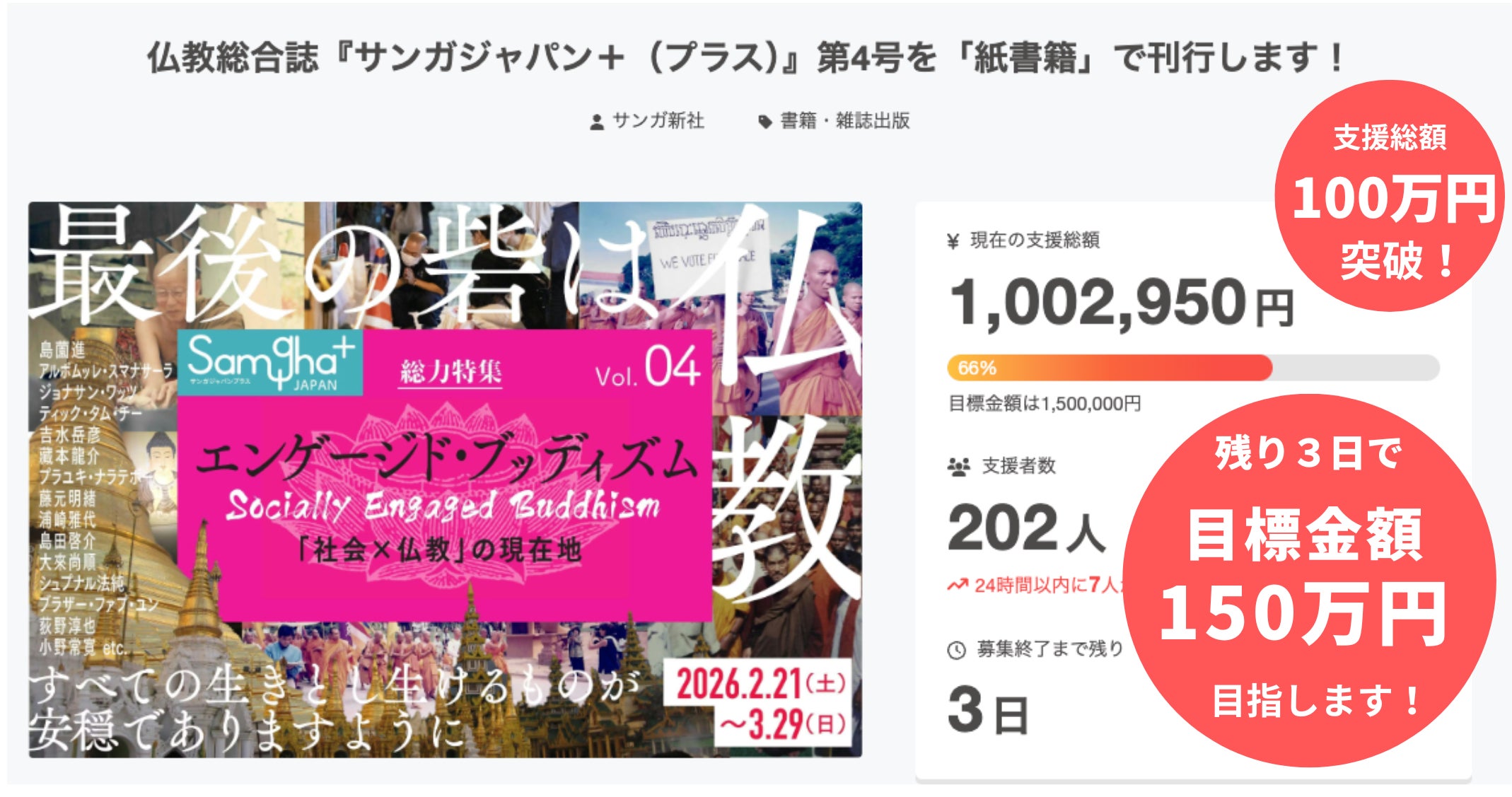 3月26日(木)午前10時時点で、ご支援総額は100万2950円、目標金額150万円に対して達成率66%となっています。