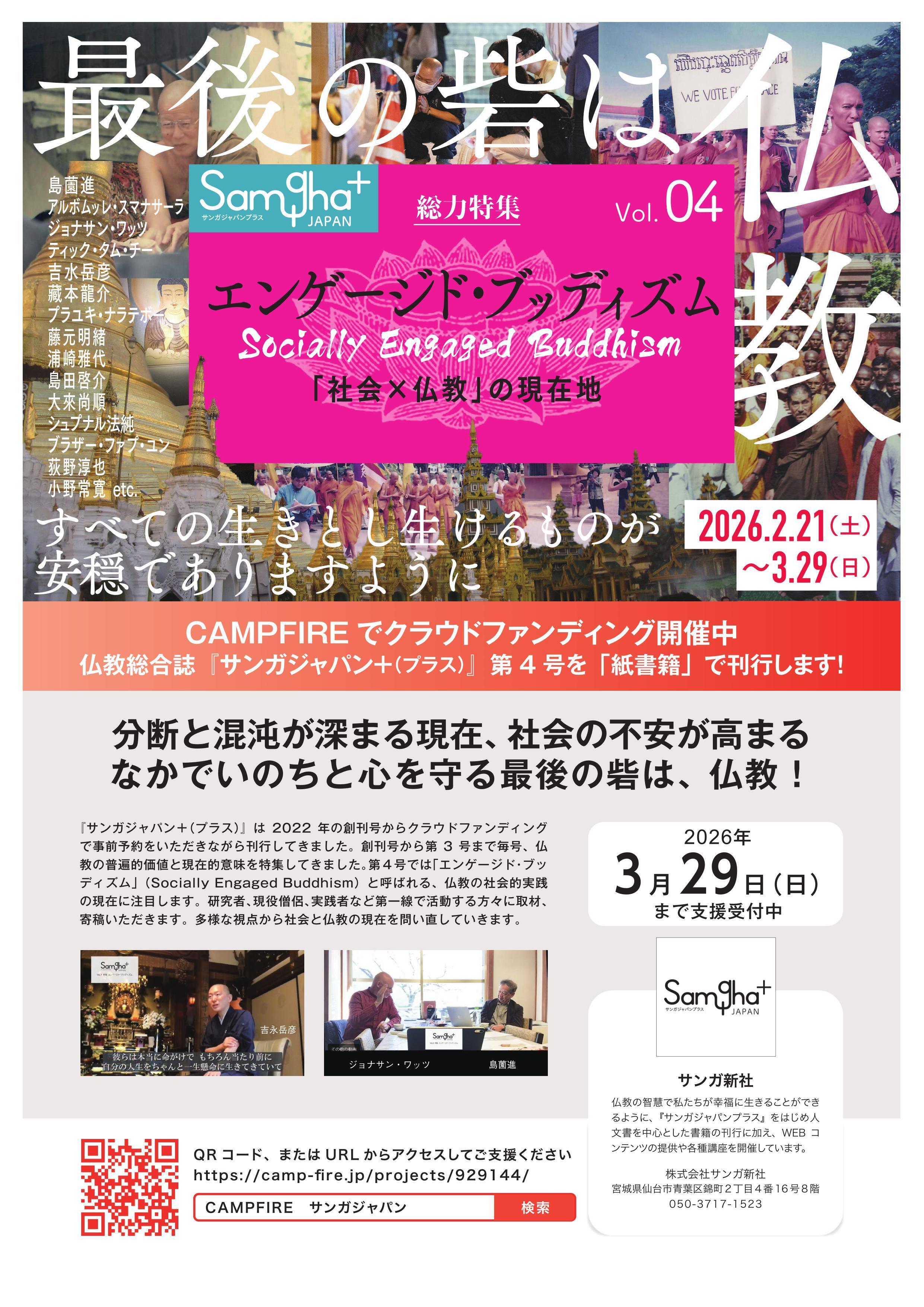 現在、クラウドファンディングに挑戦中の『サンガジャパン+Vol.4』には、プラユキ・ナラテボー師と浦崎雅代先生による対談「社会とともに生きるタイの社会開発僧 ~ルアンポー・カムキアン師を偲んで~」が掲載されます。