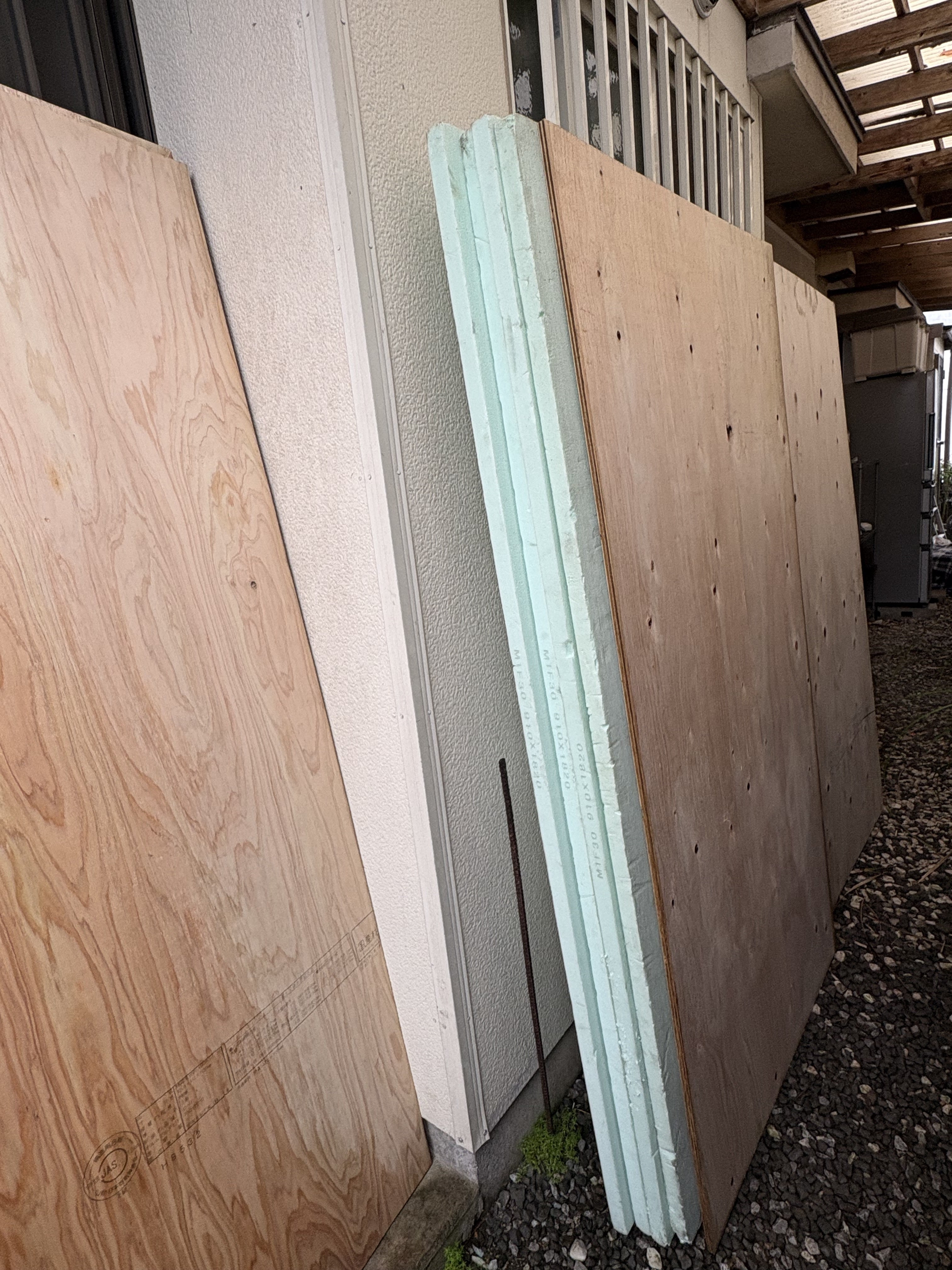 お客様に猫達のお部屋の計画のお話しをしましたら、断熱材と床板をご支援くださいました。頂いた建材を使ってお部屋を作ろうと思います。床板をはる作業は道具もありますし、以前作業したこともありますのでなんとか出来そうな気がします。近日中に大工になろうと思います。こんなに沢山の建材を頂き、本当に、本当に有り難いです。