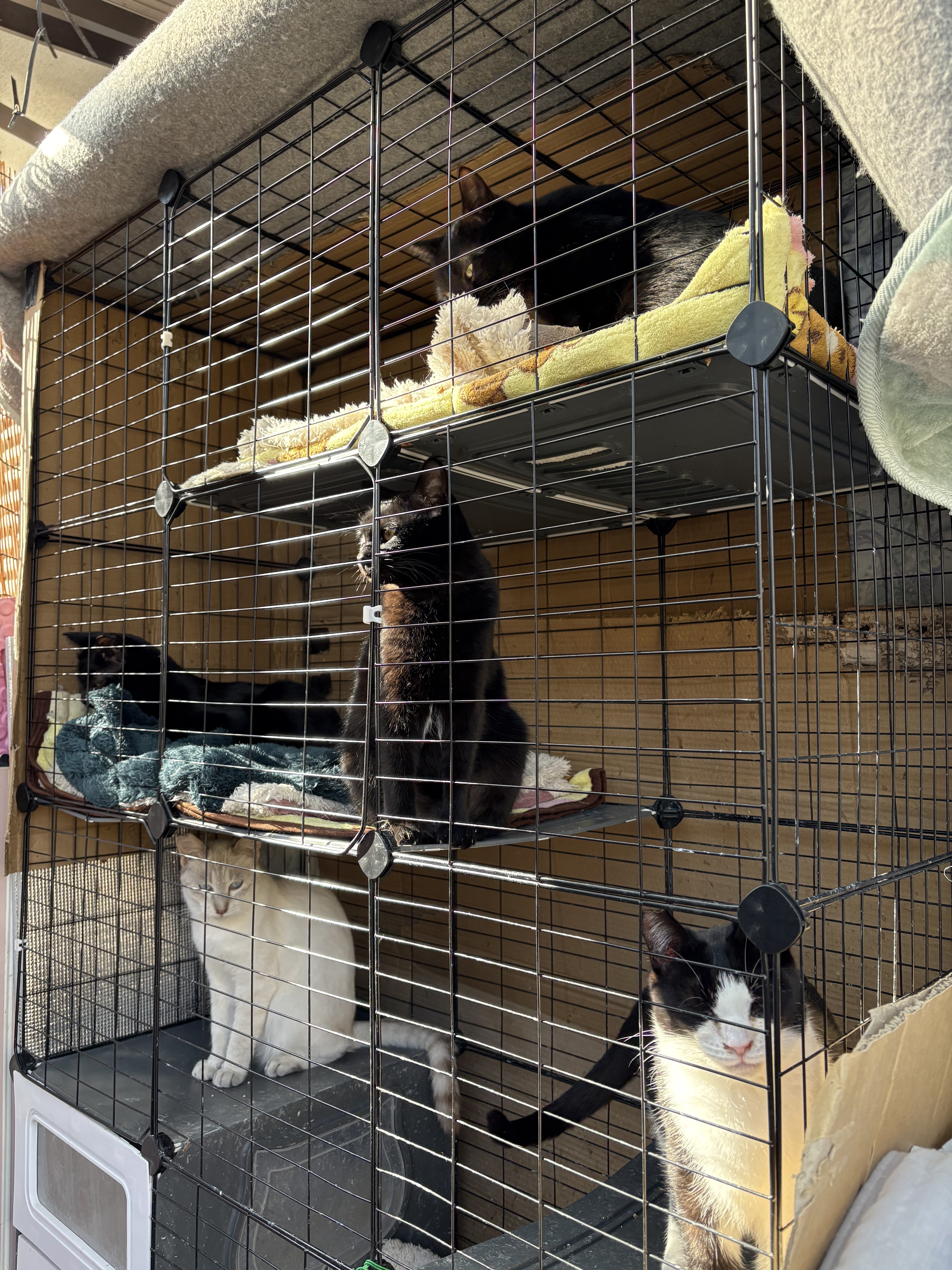 他にも外傷のある子達を保護しており、自宅の中も他の猫達がいるため限界がありウッドデッキで見守りしている子もいます。夜間は壁と暖房効果のあるものを用いて保護している状況です。