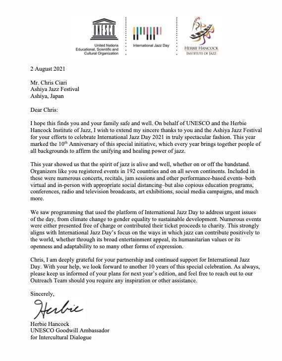 2026年3月10日付、Herbie Hancock(UNESCO親善大使)からの10周年お祝いレター