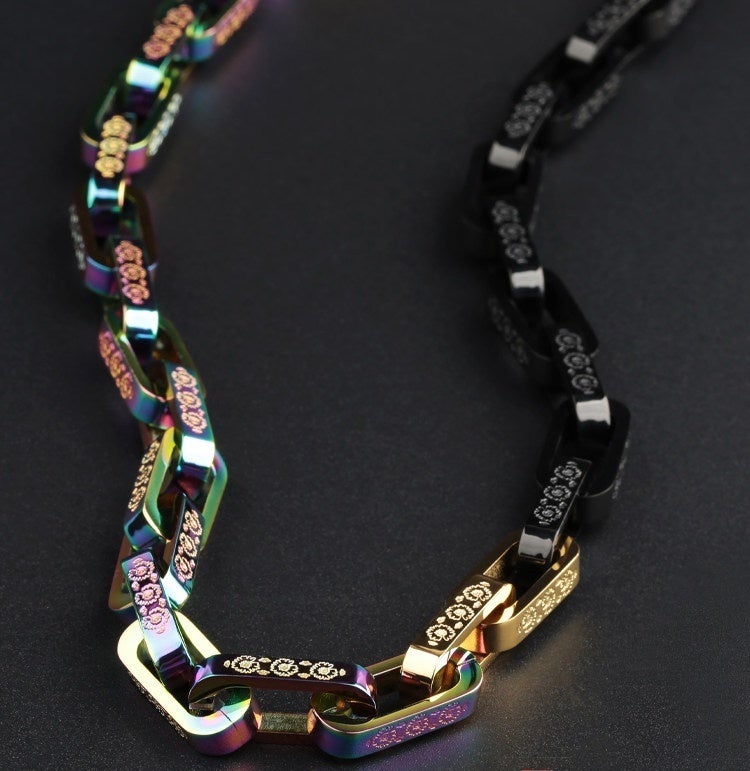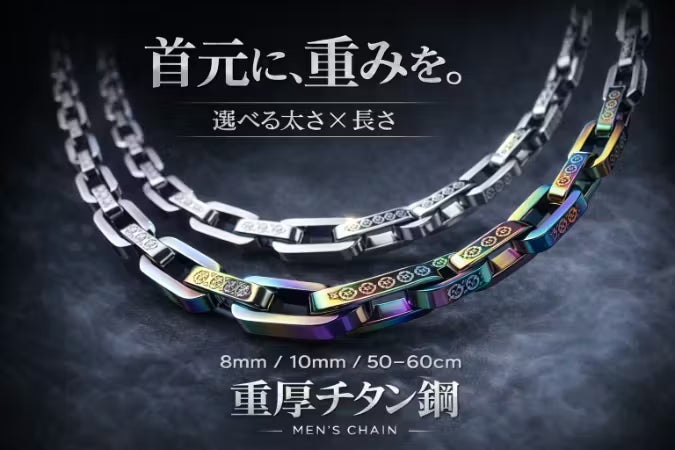 この一本は、重厚チタン鋼の冷たい輝きで、首元に“説得力”を加える。