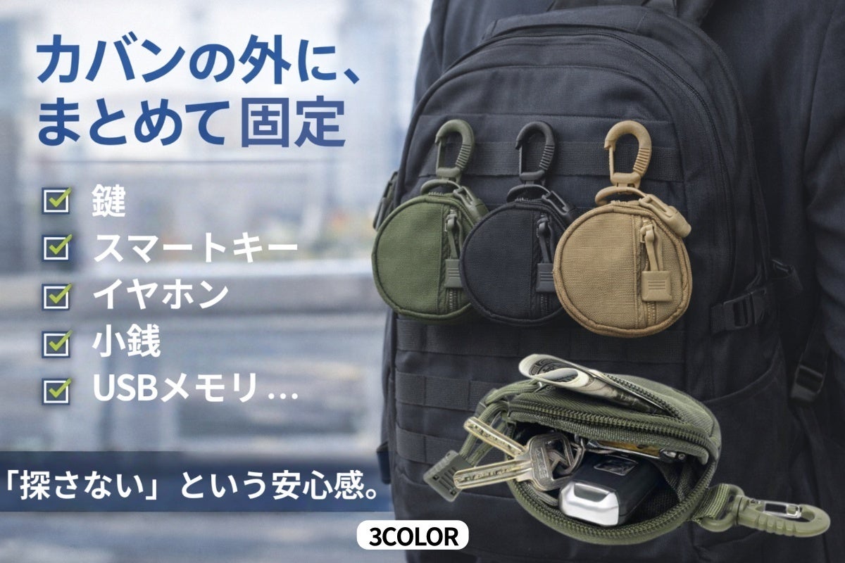 鍵だけでなく、イヤホンやUSB、小銭など日常で使う小物をまとめて外に固定できるポーチ。