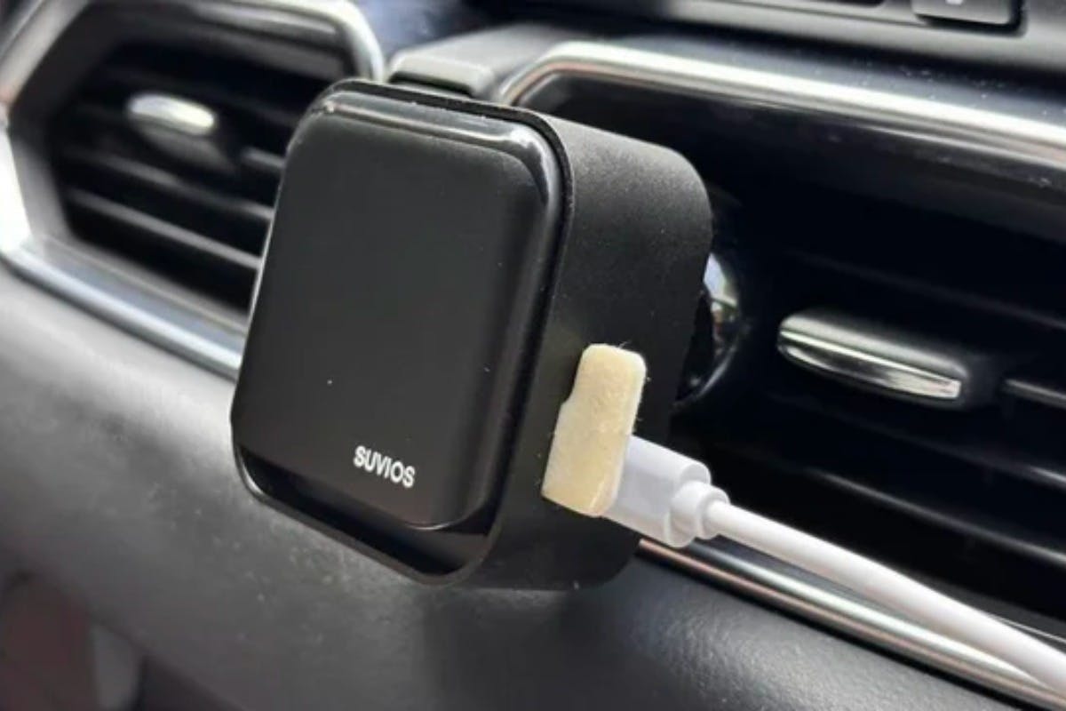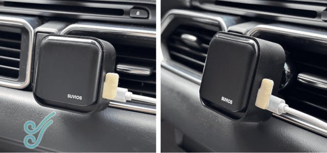 車やエアコンに付けられます。 マグネットシールを本体に貼り付けて、マウントの磁石部分とくっ付きます。