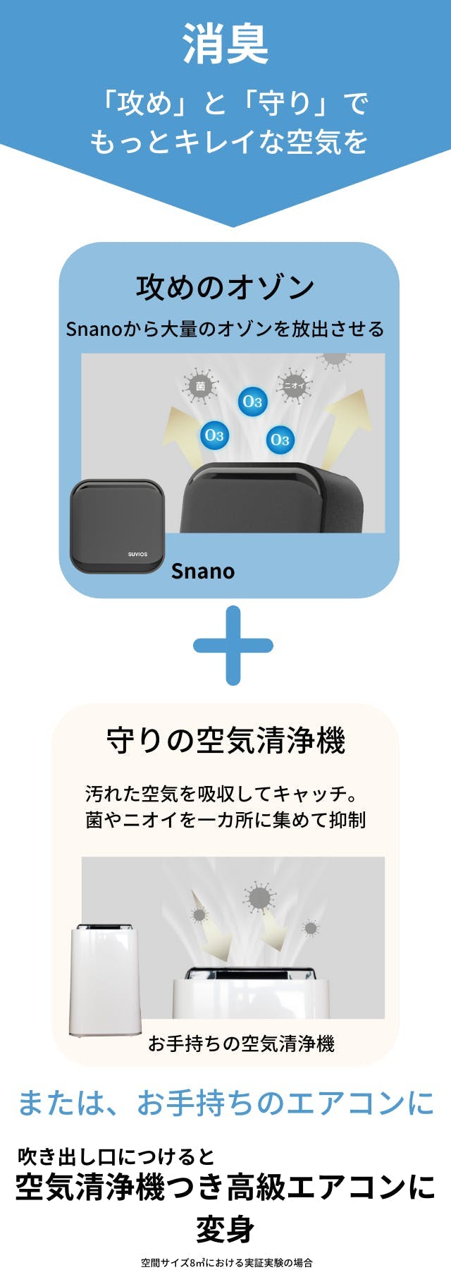 A:Snanoは縦横6cm×6cmに80gと手のひらサイズ・超軽量型空気清浄機なので、場所を取らずに設置することができます。