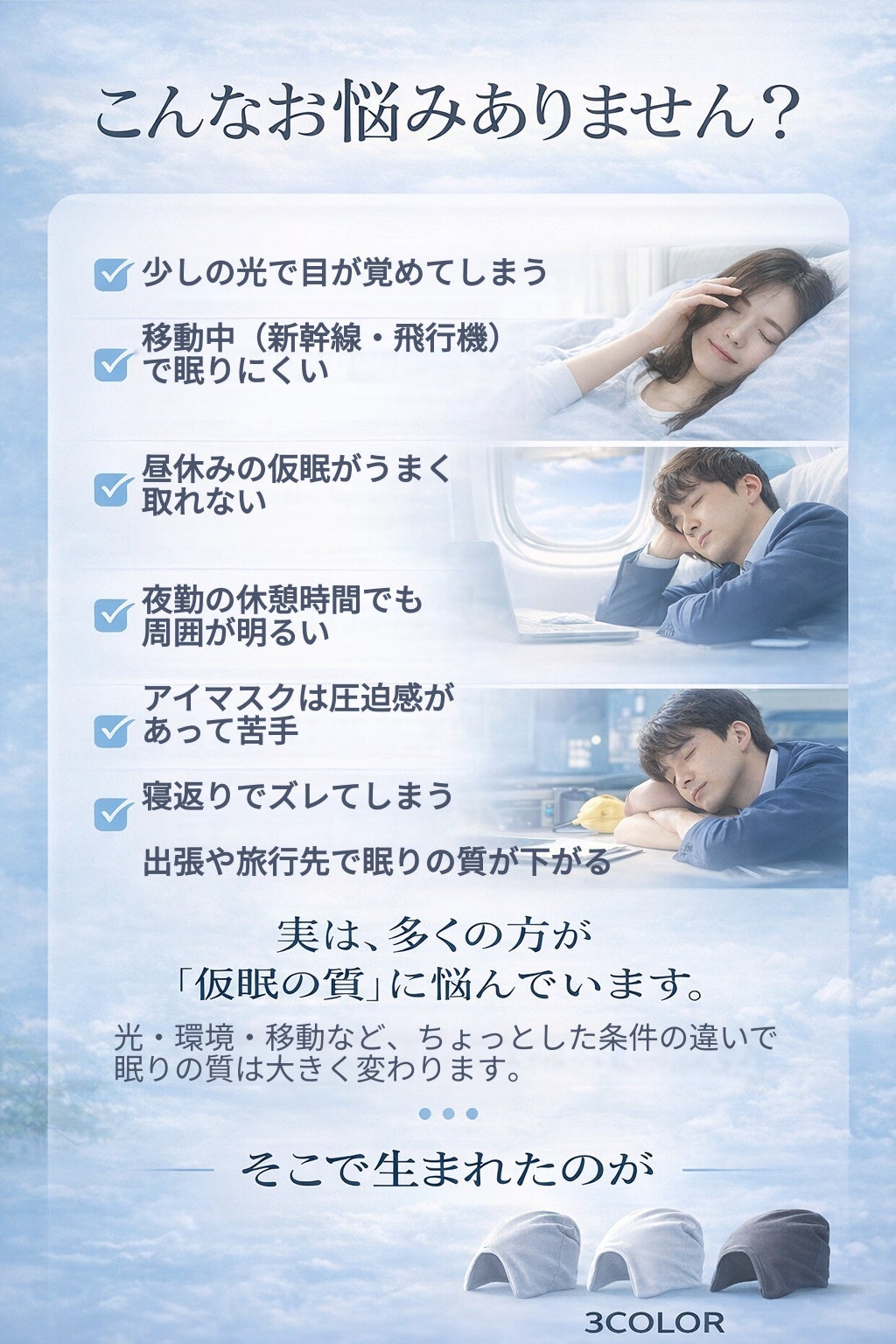 やさしくフィットし、光を遮り、自宅でも移動中でも使える“新しい快眠サポートアイテム”です。