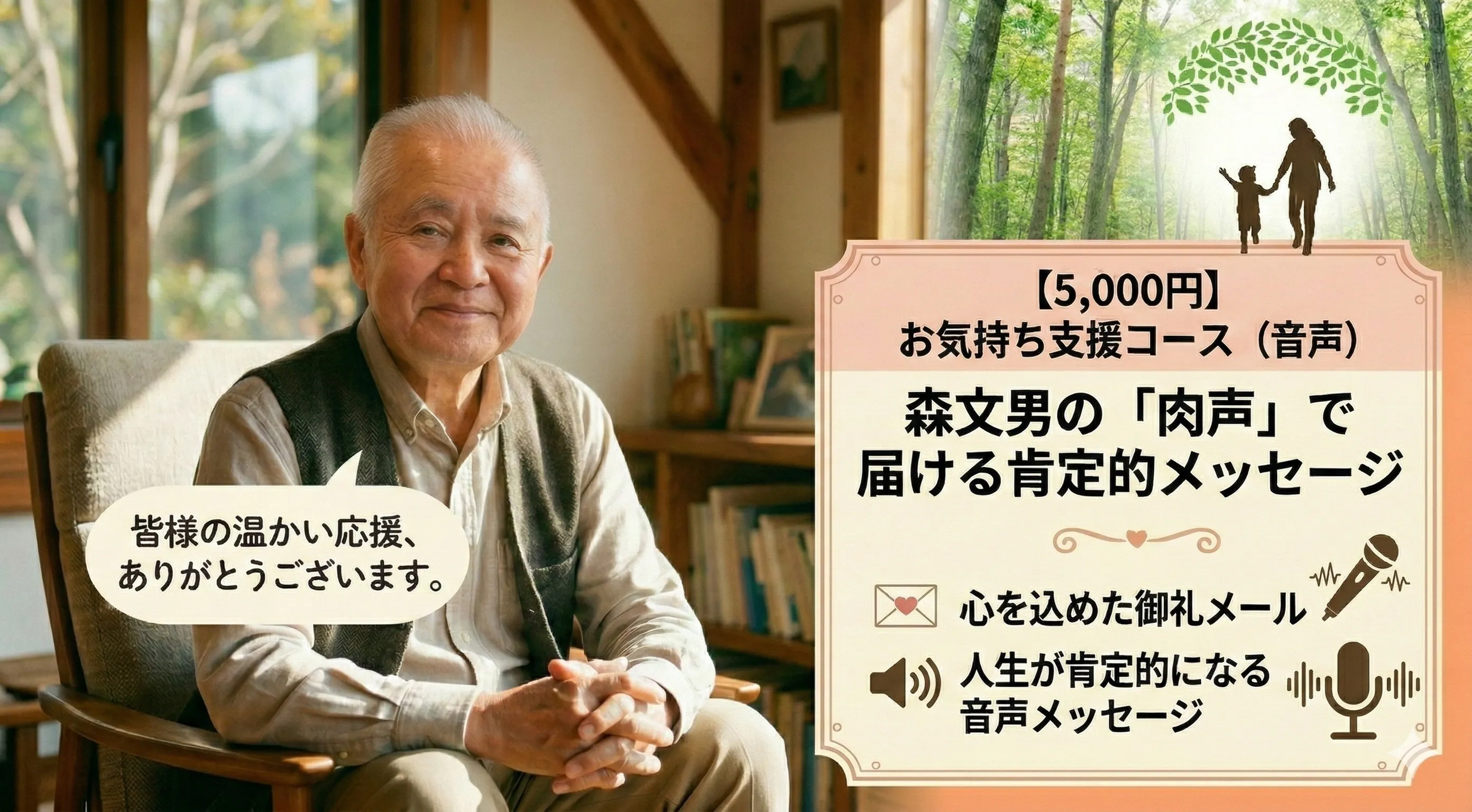 心を込めた御礼メールと、人生が肯定的になる音声メッセージ(森文男の肉声)をお届けします。