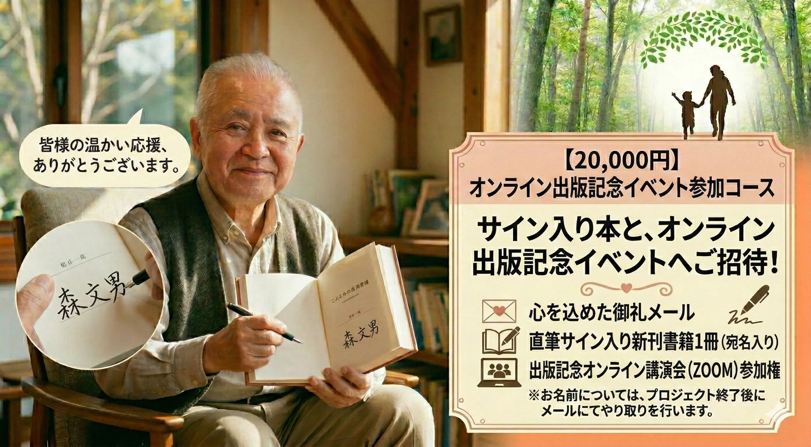 心を込めた御礼メールに加え、今回制作する新しい書籍1冊に、あなたのお名前(宛名)と直筆サインを入れてお届けします。