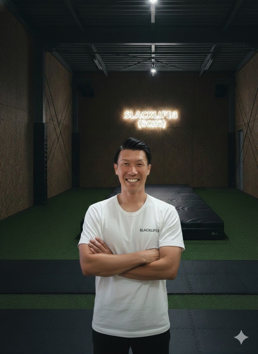 スラックラインに出会い16年、私はこのスポーツが持つ「究極の集中」と「体幹へのアプローチ」に魅了され続けてきました。日本チャンピオン(マスターズ)という結果も残してきましたが、私にとってのスラックラインは単なる競技ではなく、心身を整えるための手段です。