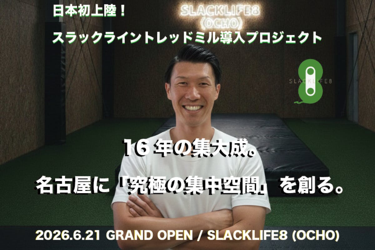 2026年6月21日、名古屋市守山区に、大人も本気で通いたくなる洗練されたスラックライン施設『SLACKLIFE8 (OCHO)』をオープンします。 この施設の最大の目玉であり、日本初上陸となる「スラックライン専用トレッドミル」の導入資金を集めたい。