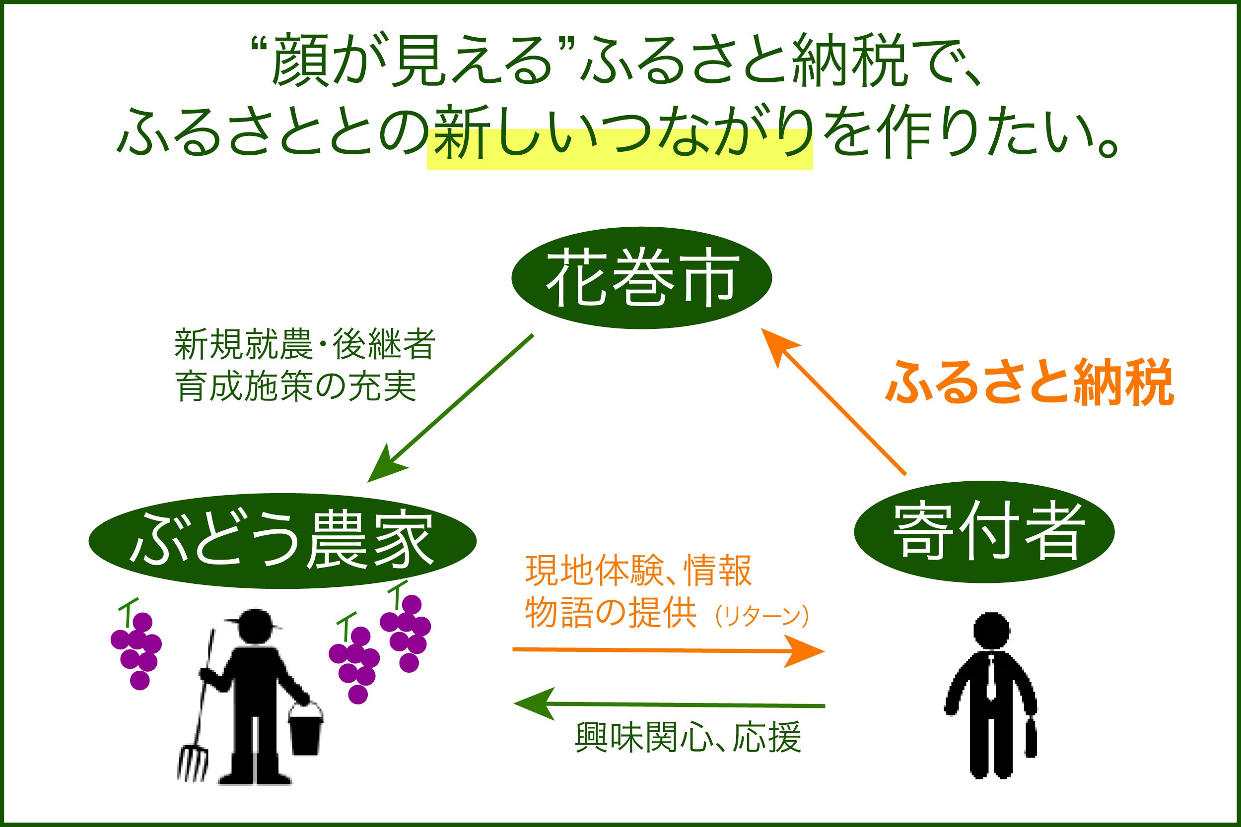 花巻市が、今もっとも力を入れている事業が、大迫のぶどう農家の新規就農支援や後継者育成です。ぶどう栽培技術習得のための相談窓口の設置や、醸造のハードルを下げる”クラフトワイン・シードル特区”など、制度面でぶどう農家やワイン造りをサポートしています。一方で、ソフト面で実際に人を呼びこみ、ファンを作るのは、現場で頑張っているカンタのような人間です。地域おこし協力隊として働いた3年間で、カンタは地域の人々から必要とされる人間になりました。行政として個人を支援することはできませんが、ふるさと納税という仕組みを通じて大迫のぶどう農家の人々と一緒にファン作りができるのではないかと考えました。