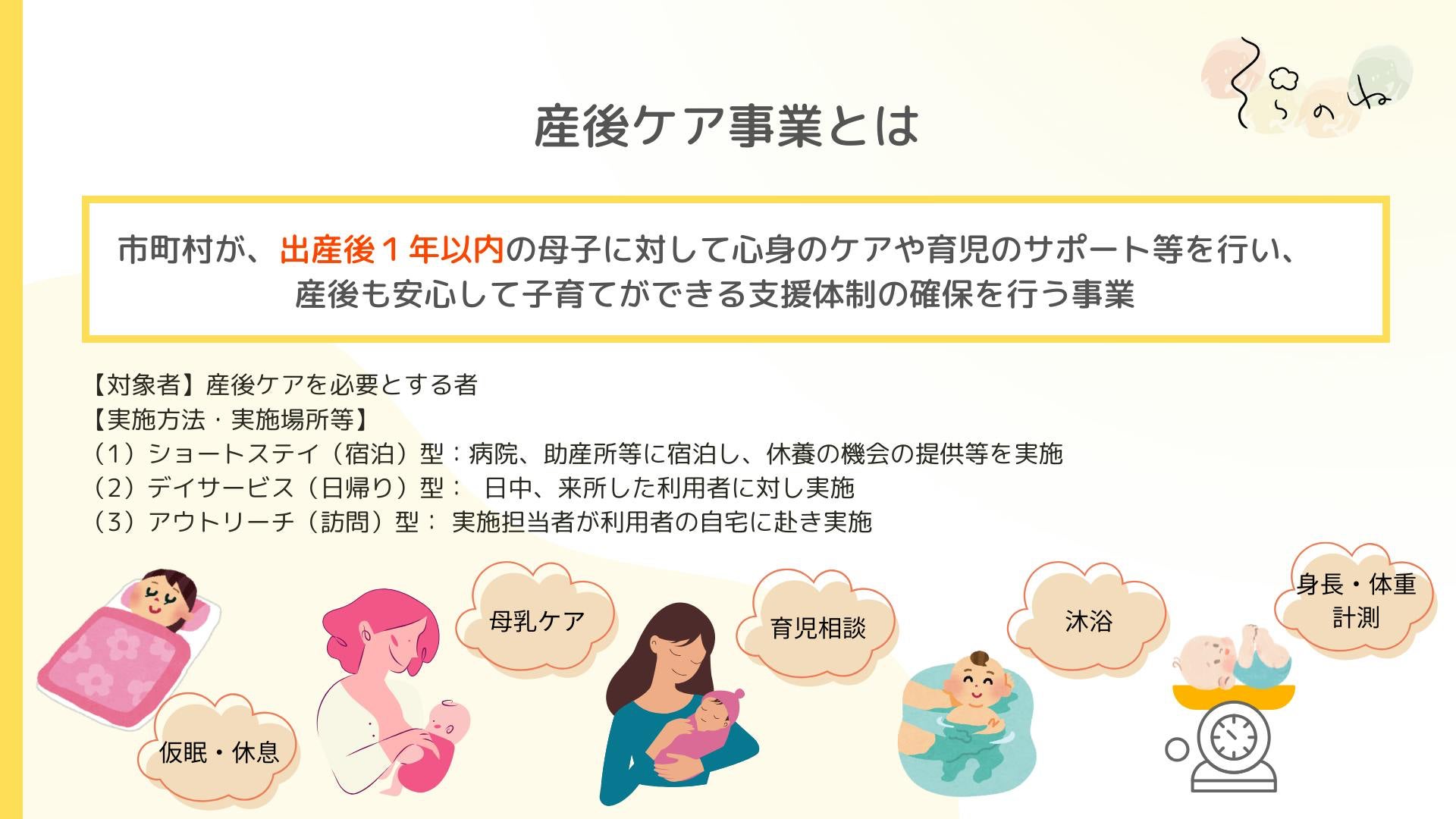 2019年には、母親の孤立に加え、『母子とその家庭が健やかに生活できるように支援するため、産後ケア事業の全国展開を図ることを目的』として産後ケア事業が法定化されました。