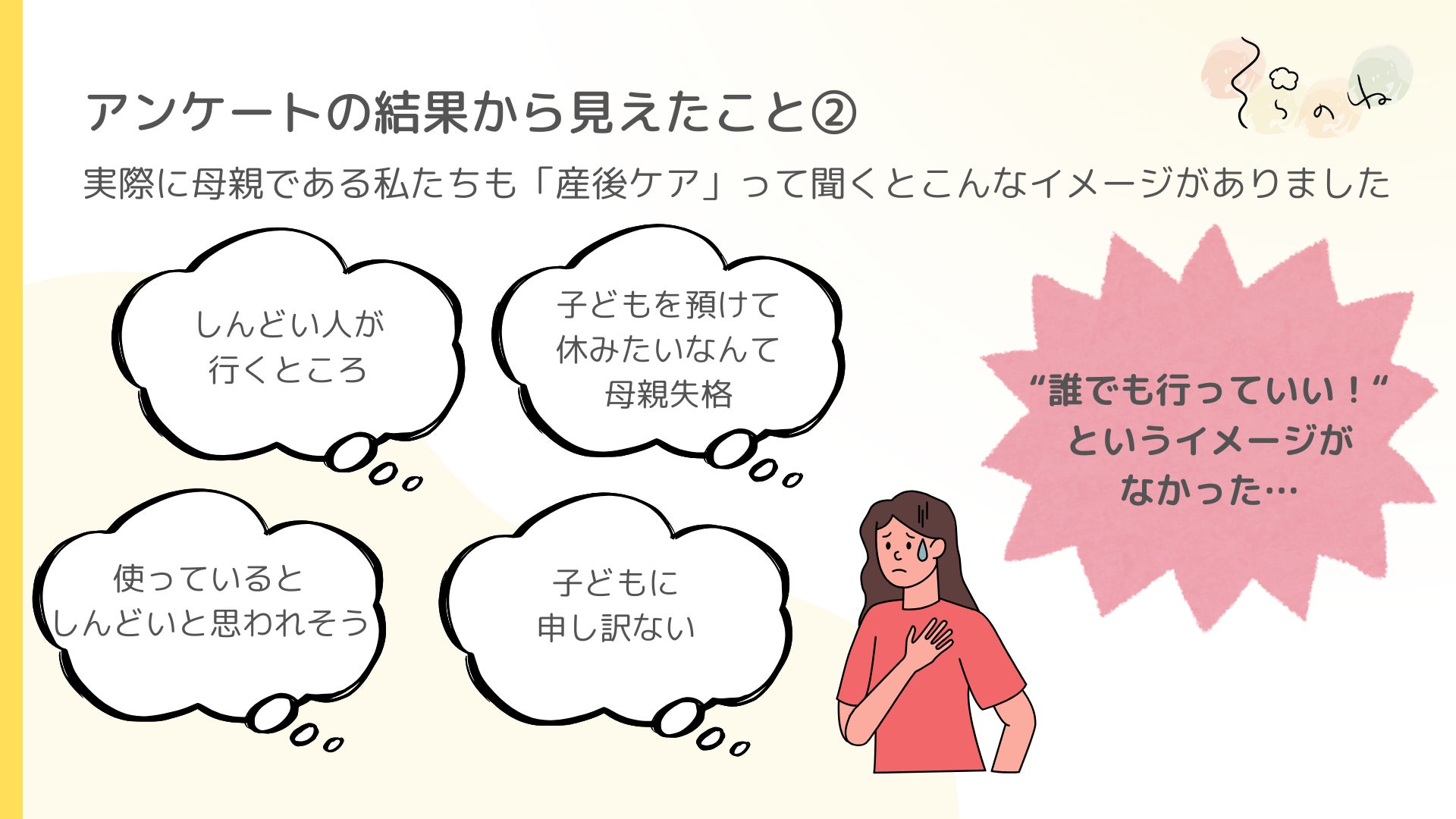 また、ふたご・みつごを受け入れている施設が少なく、本来産後1年間は産後ケアを利用できるはずなのに、受け入れ施設がないために必然的に利用できない状況にあります。