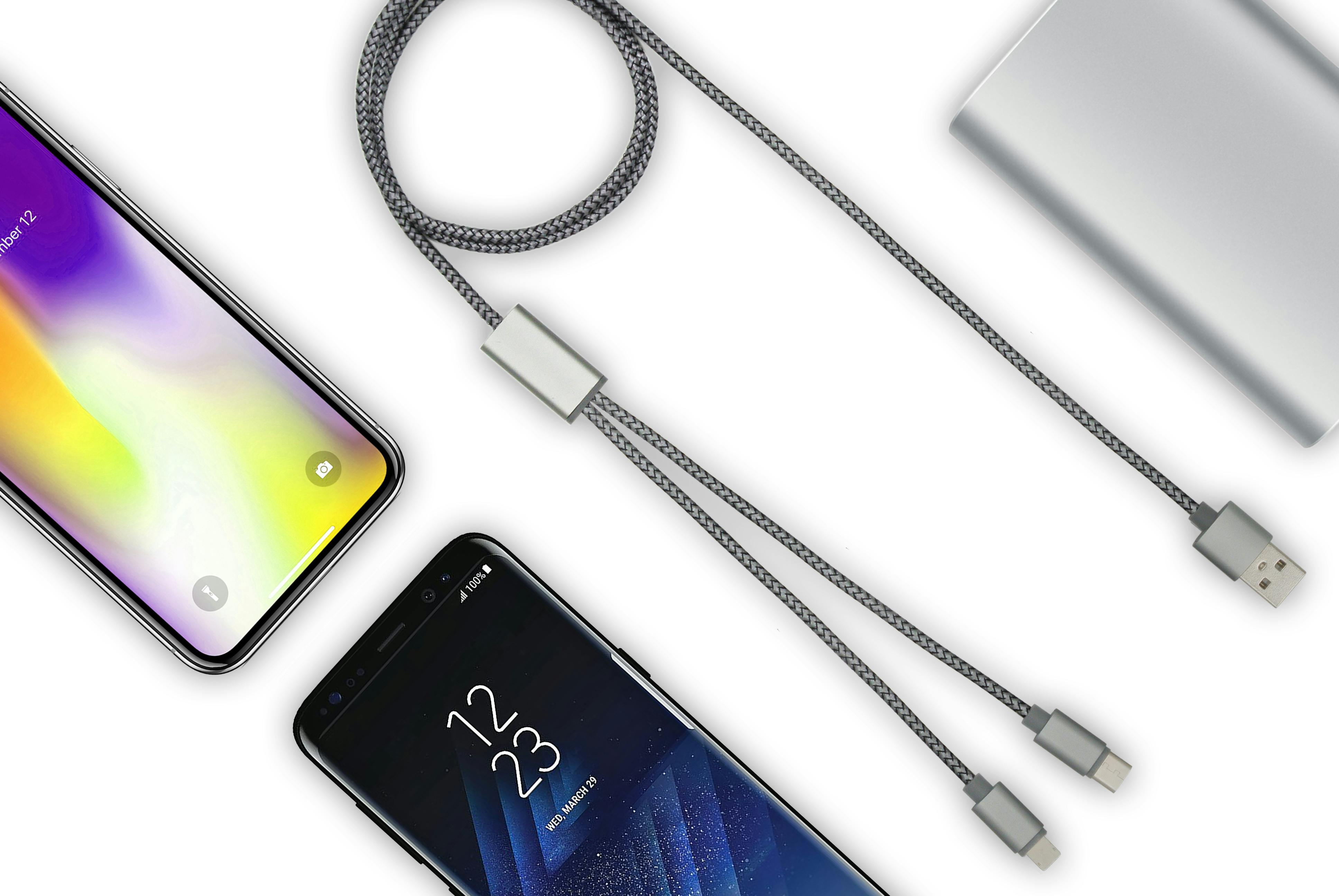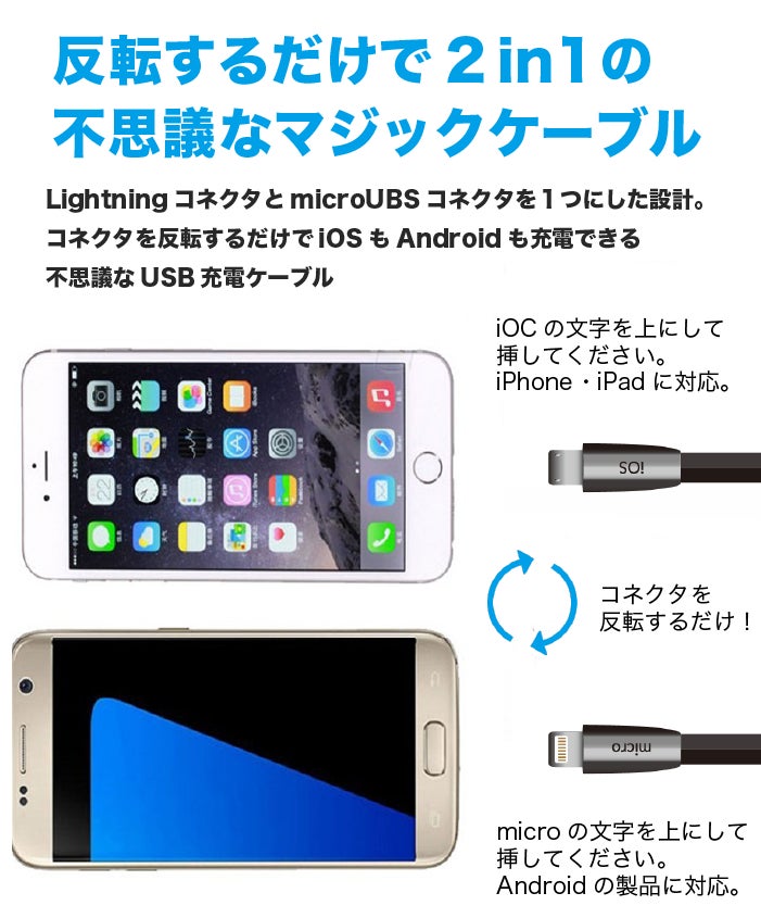 コネクタを変えずに反転するだけで、iOS端子(Lightning)にもandroid端子にも挿しこめる便利な充電ケーブル・・